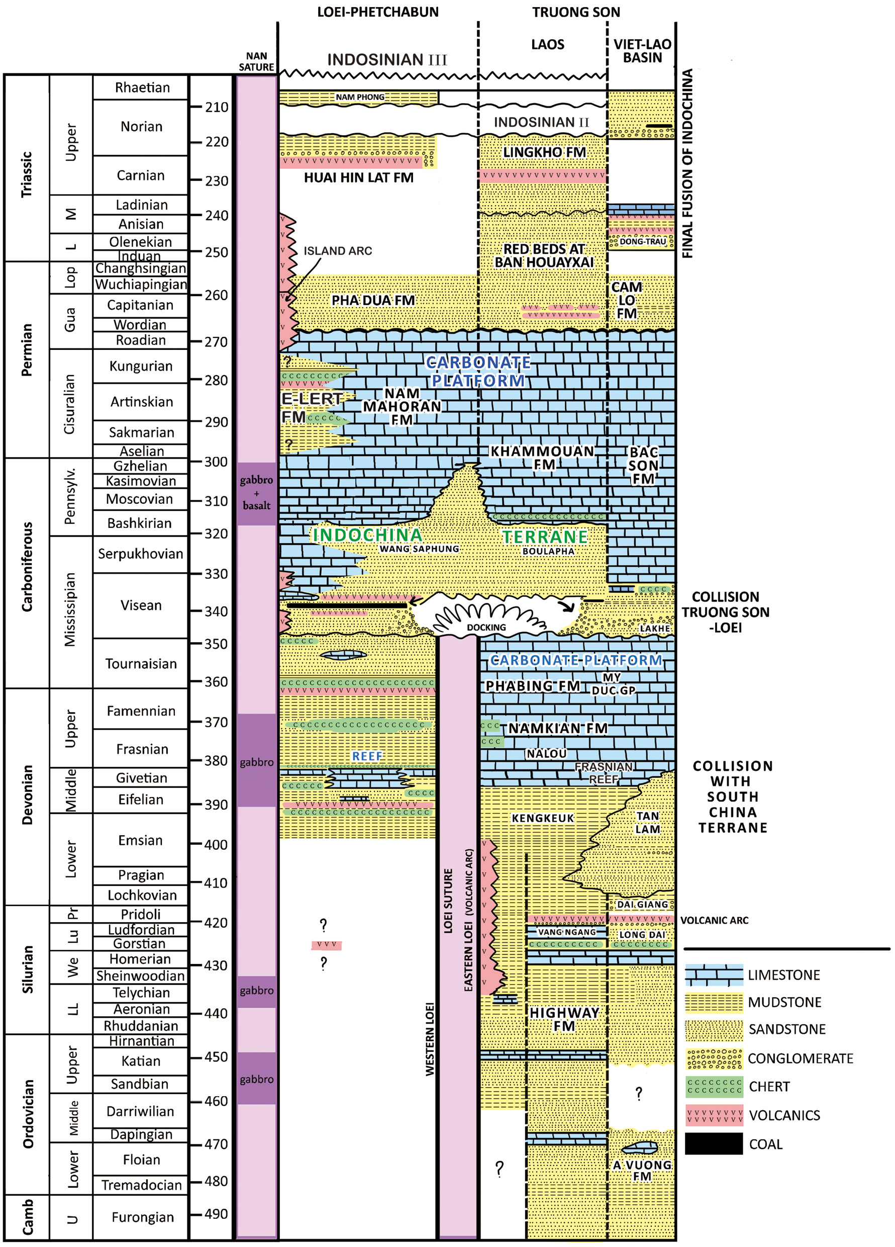 Summary diagram of present hypothesis showing summaries of stratigraphies, deformation episodes, and magmatic events in the Loei-Phetchabun and Truong Son terranes. Stratigraphic data are from numerous sources. Ordovician gabbro within the Nan Suture is from Khin et al. (2014) and Long et al. (2019) and Devonian and Carboniferous dates are from Shen et al. (2010a). The Tan Lam Formation in the Vietnamese sector of Truong Son represents the influx of coarse terrigenous siliciclastics caused by the first collision of the Truong Son Terrane with the South China Terrane in the late Silurian to Early Devonian.
