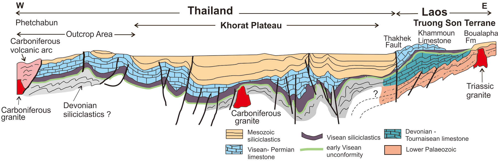 Cross-section from Phetchabun Province in the west to Vietnam in the east. Line of section is shown as A-B on Figure 1. The Khorat Plateau in NE Thailand and adjacent parts of Laos and Cambodia is covered by the Rhaetic to late Cretaceous terrestrial siliciclastics of the Khorat Group and correlates (Mesozoic siliciclastics in legend). The subsurface geology of the Khorat Plateau is based on seismic interpretations and petroleum wells summarized in Booth and Sattayarak (2011) and Minezaki et al. (2019). The Thakhek Fault in the eastern part of the cross section (Figure 1) is a late Cenozoic transcurrent fault zone due to continued impingement of India into Asia and resultant indentation tectonics. This fault was (and is) active during the Quaternary (Thom et al., 2015) and may be a reactivation of an older structure. Deformation of the pre-Visean strata caused by the Loei-Phetchabun and Truong Son terrane amalgamation in the latest Tournaisian to earliest Visean. Deformation of the Visean and Permian strata was due to subsequent docking of terranes during the Triassic and the Himalayan orogeny.