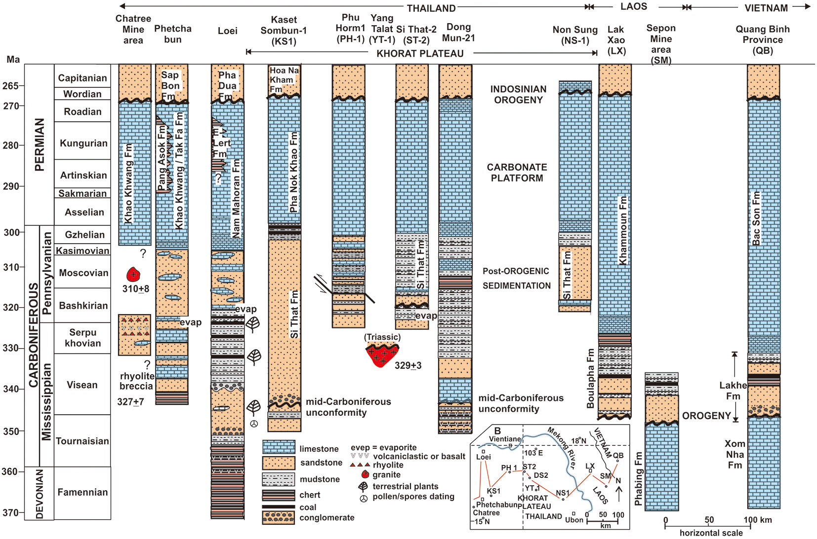 Diagram showing stratigraphic successions from Famennian (Late Devonian) to mid-Permian across the Indochina region based on numerous authors. Line of section from Phetchabun Province and Loei Province of Thailand across the subsurface of the Khorat Plateau to Laos and Vietnam is shown in inset map.