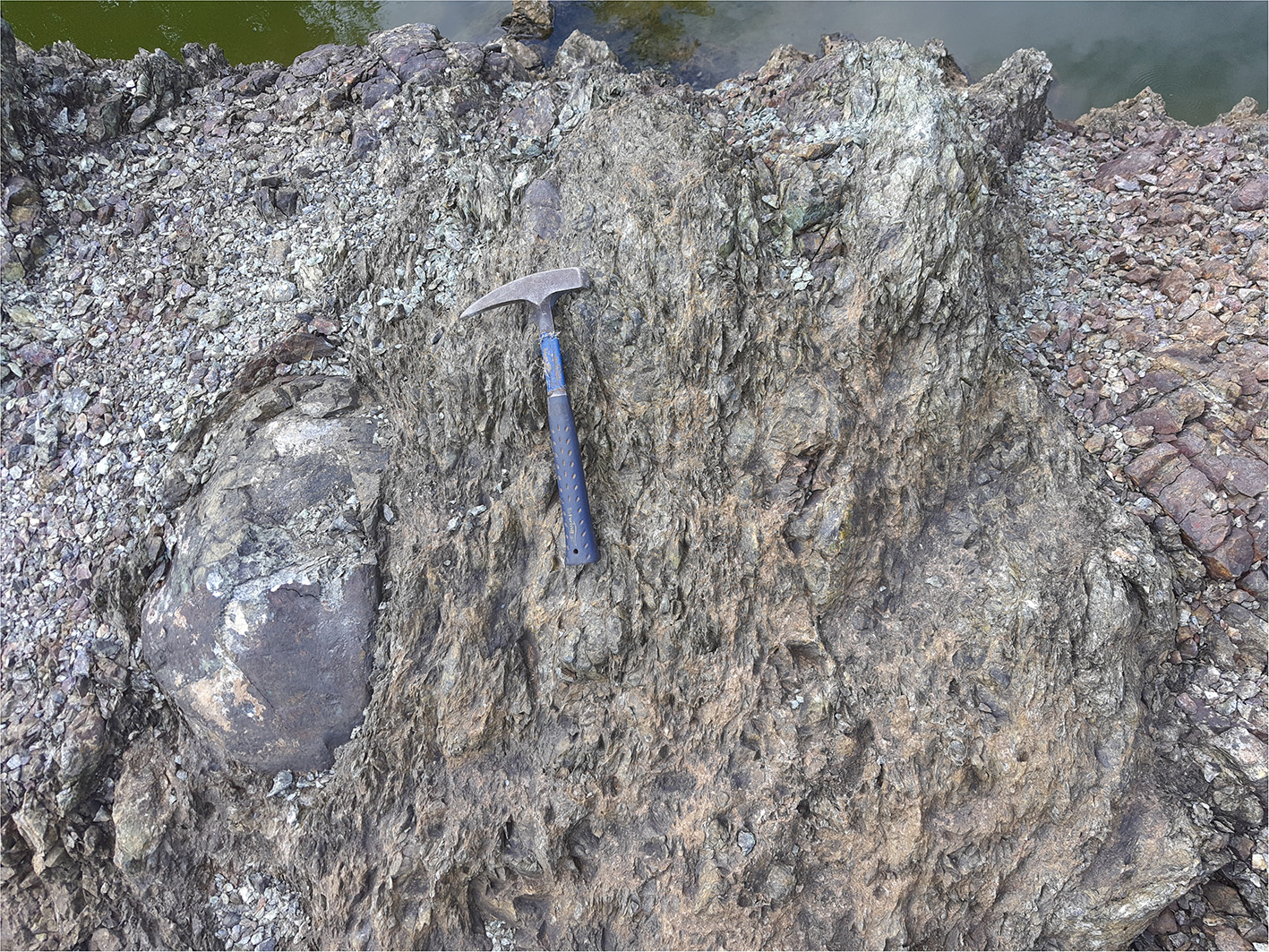 Serpentinite outcrop from east of Pak Chom, Loei “Foldbelt,” N.E. Thailand with some areas showing original dunite texture. This and other outcrops of serpentinite mark the Loei Fault/ Suture separating the Loei-Phetchabun Terrane in the west from the Truong Son Terrane in the east in the Loei “Foldbelt”.