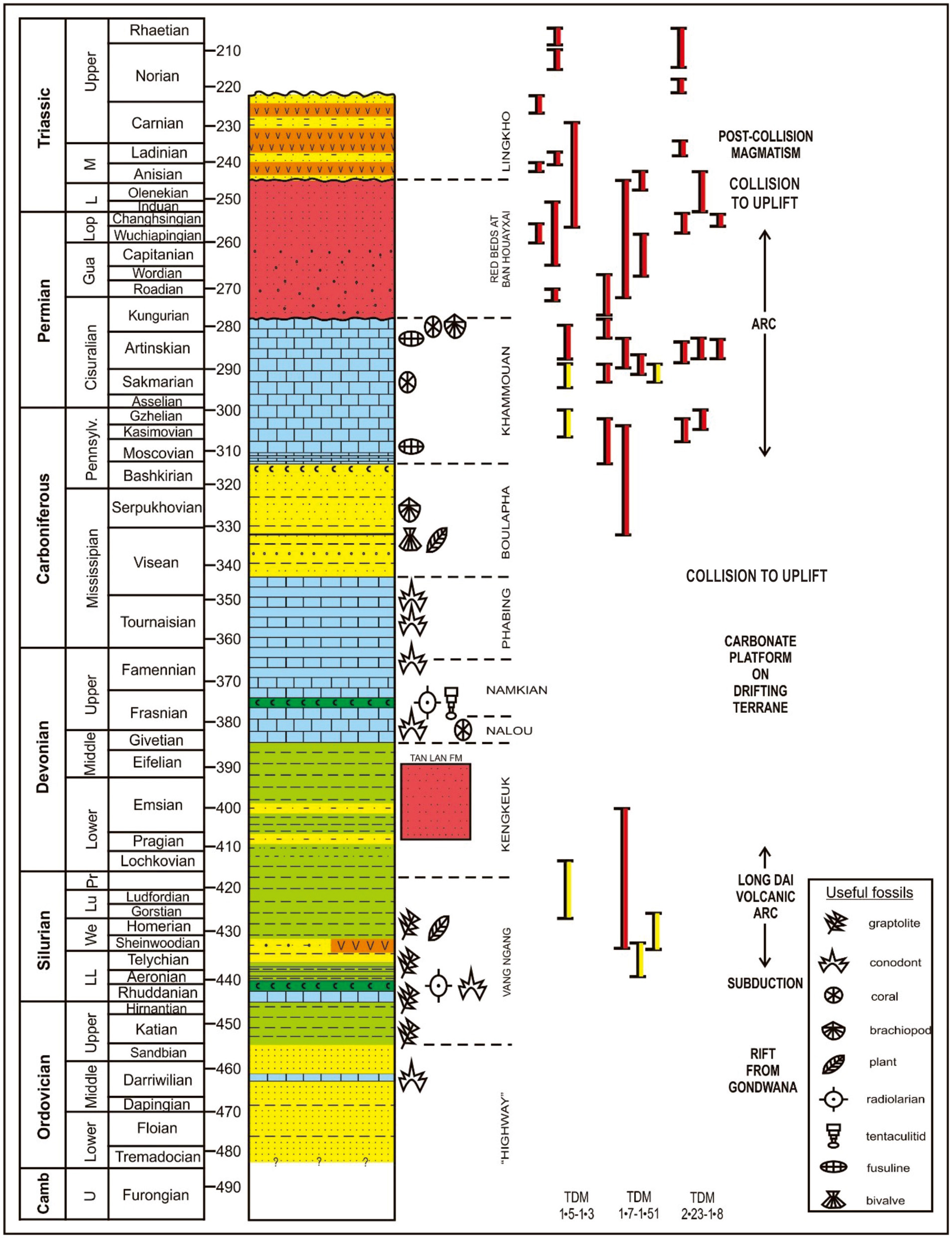 Stratigraphic and plutonic igneous summary of the Truong Son Terrane based mainly on successions at well-dated formations at the Sepon Mine. The Tan Lam Formation in the Vietnamese sector of Truong Son represents the influx of coarse terrigenous siliciclastics caused by the first collision of the Truong Son and South China along the Song Ma Suture in the late Silurian to Early Devonian. Red lines are age ranges of felsic igneous rocks including granites and rhyolites. Yellow are andesites and diorites. Compiled from numerous sources.
