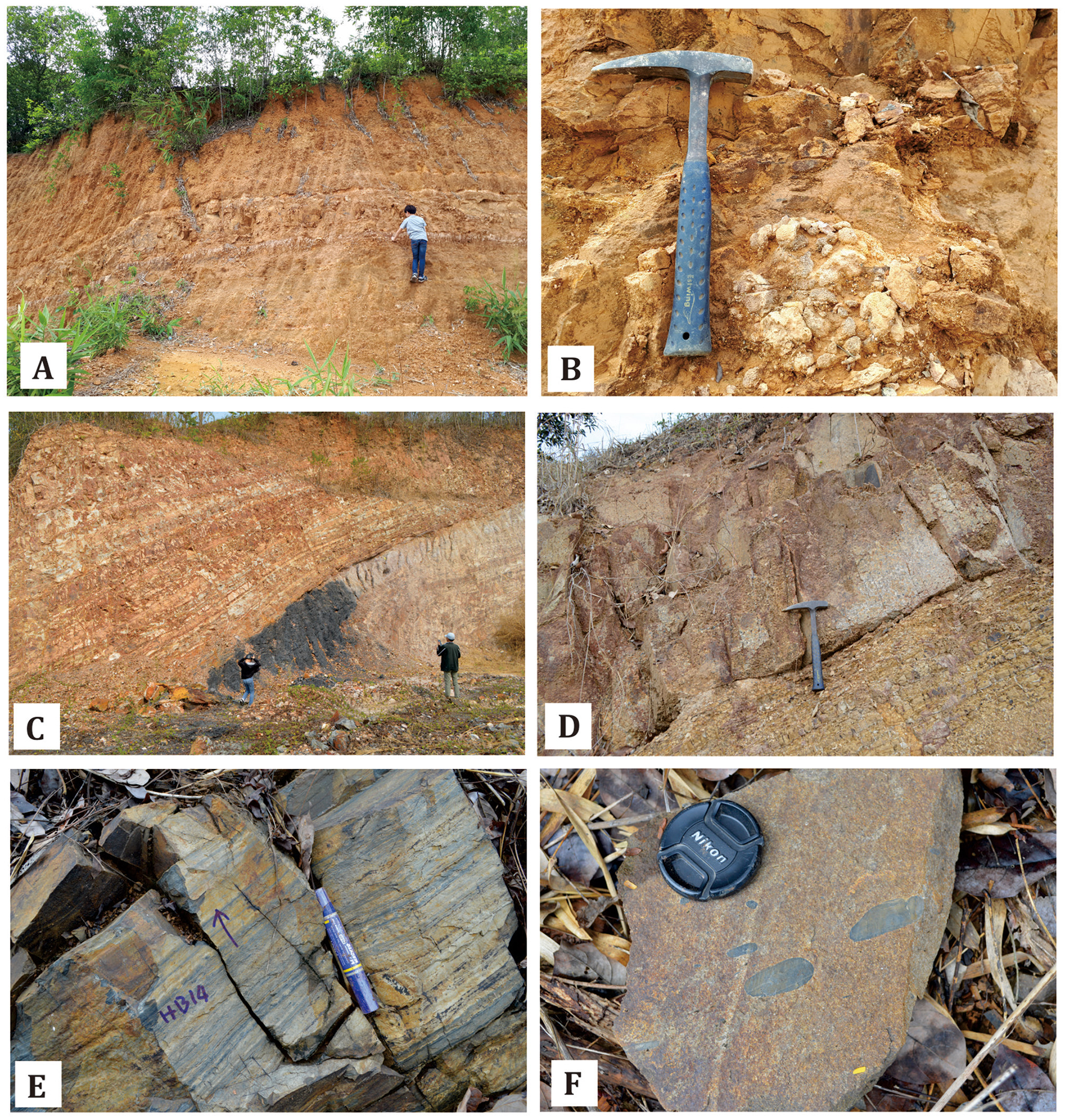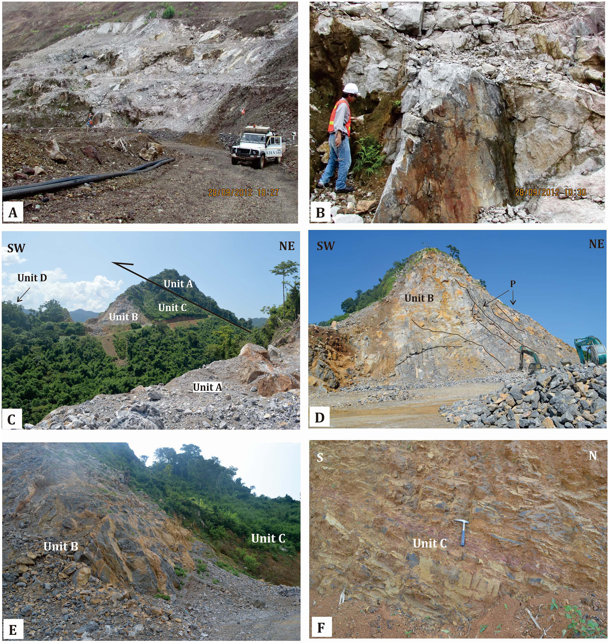 Deformed and stratigraphically out-of-sequence light colored Wenlockian age limestone associated with black early Silurian graptolitic shales, and late Silurian radiolarian cherts of the Vang Ngang Formation at Sepon Mine, Laos. Southern margin of Truong Son Terrane. This is possibly an accretionary prism. (A) Sharp contact of Wenlockian limestone unit with Llandoverian shale and Ludlovian chert sequence. (B) Close-up of Wenlockian limestone showing strongly sheared block of the limestone [see Loydell et al. (2019) and Thassanapak et al. (2018) for details].Truong Son Terrane, Laos. Field photographs of limestone quarry 20 km south of the Sepon mine but north of Tamky-Phuoc Son Suture (Figure 1 for location), near southern margin of Truong Son Terrane showing Middle to Late Devonian and lower Carboniferous carbonate and younger siliciclastic succession. (C) Showing thrust slice of Middle to Upper Devonian carbonate succession (Unit A, as seen in foreground) over lower Carboniferous carbonate-siliciclastics (Units B, C, and D). (D) Main quarry showing complex structure including thrust fault with phacoid (P) and recumbent fold with vergence to the south. (E) Gradational contact between Unit B and Unit C showing evidence of upwards shallowing. (F) Unit C, siliciclastics - mainly light brown and red shale, interbedded with thin bedded siltstone and sandstone of a probable deltaic environment.