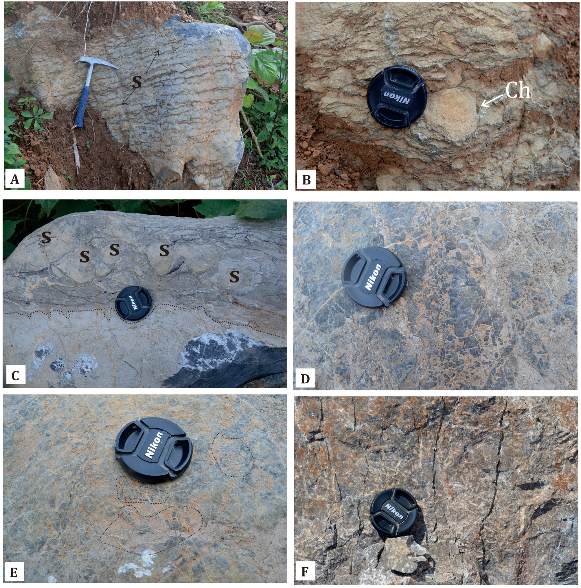 Facies variation of limestone from Unit A of Figure 9. (A) Stromatolitic limestone (algal laminite) with small domal stromatoporoid. (B) Stromatolitic limestone with Chaetetes (Ch) (sponge) in growth position. (C) Micritic limestone with truncation on top and overlain by limestone breccia (intraformational breccia). The sharp truncation suggests aerial exposure and karstification. Clasts of limestone breccia consist of large domal fragments of stromatoporoid (S), skeletal debris, and lithoclasts. (D,E) limestone breccia with abundant clasts of tabulate corals (?Thamnopora). This evidence suggests the existence of a stromatoporoid-coral reef prior to the collapse of the carbonate platform. (F) Reef limestone (foreground of Figure 9C) showing abundant Stachyodes (stromatoporoid).