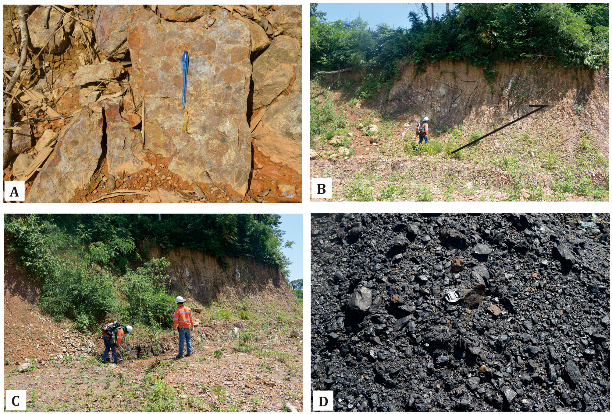 Field photograph of Unit D of probable Boualapha Formation correlate 20 km south of the Sepon Mine but north of Tamky Suture (see Figure 1 for location). This unit consists mainly of a folded siliciclastic sequence, but the main competent units dip at 400N. The lithofacies of this unit suggests a fluvial environment which overlies Unit C. Unit D consists of siltstones, quartz arenites, pebbly arkosic sandstone, quartzites, and conglomerates. (A) Conglomerates, (B) Folded fine siliciclastics with coal seam and plant remains. Vergence of the fold is to the south, (C) Unit D with coal seam, (D) Close-up of anthracitic coal.