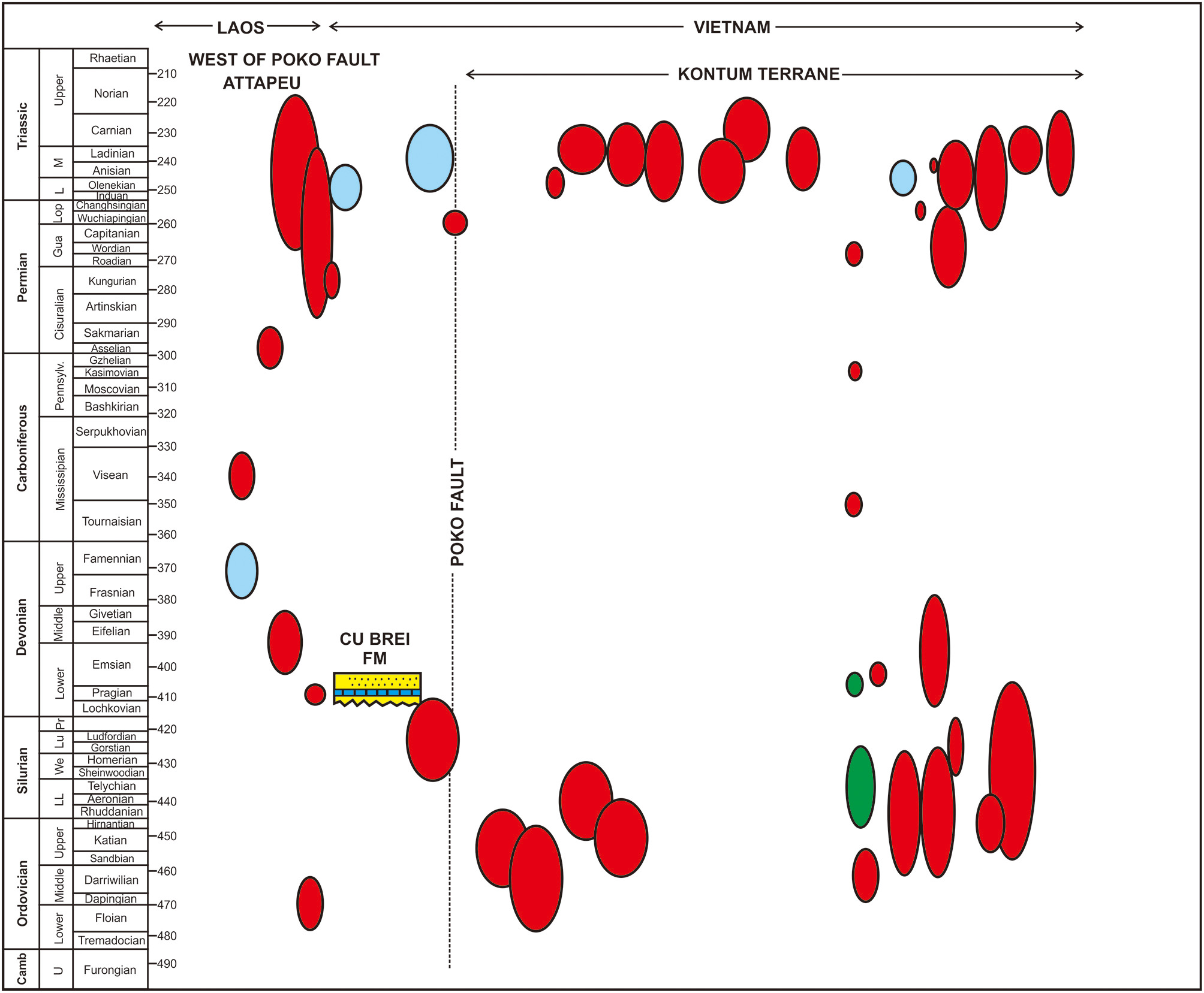 Summary of plutonic magmatism in the Attapeu region of Laos (AT on Figure 1) and adjacent areas in Vietnam, west of the Poko Fault (POK on Figure 1) and the Kontum Terrane east of the Poko Fault. Note the significant difference in magmatic history and stratigraphy on either side of the Poko Fault. Note that the Early Devonian Cu Brei Formation is west of the Poko Fault and, unlike the Kontum Terrane, is unmetamorphosed. Palaeozoic strata do not outcrop on the Kontum Terrane. Light blue = intermediate – mafic intrusives, red = felsic/acidic intrusives, and green = amphibolites -mid-plate tholeiites.
