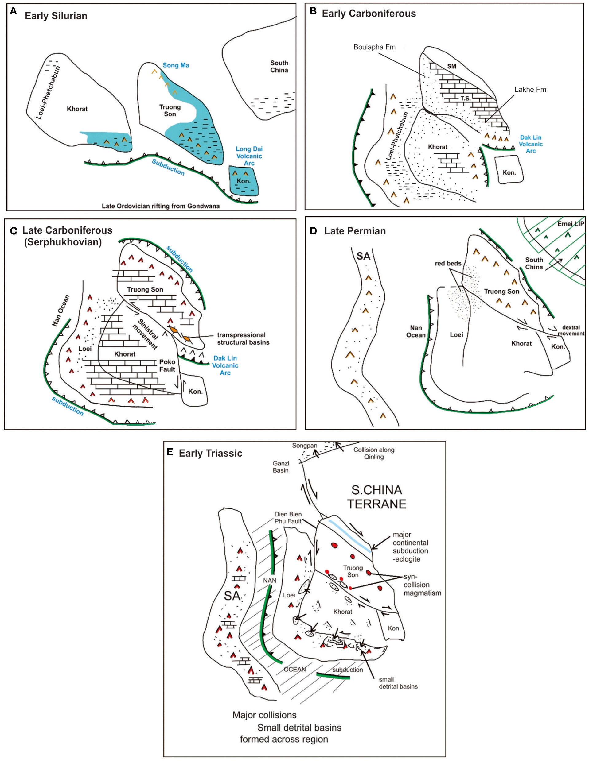 Speculatively, the deformed and stratigraphically out-of-sequence graptolitic shales, limestone, and radiolarian cherts of the Vang Ngang Formation in the Sepon Mine area are typical of accretionary prisms and may constitute a fore arc assemblage (Thassanapak et al., 2018) (Figures 9A,B). The deep-water Silurian succession of southern Truong Son grades north into shallower marine siliciclastics (Thassanapak et al., 2018). By the late Silurian, coarse siliciclastics in the central Vietnamese part of Truong Son containing South China-type fish may indicate the first contact between Truong Son and the Song Da Terrane of the composite South China Terrane in North Vietnam (Janvier et al., 1997; Thassanapak et al., 2018).