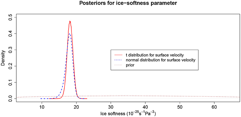 Figure 2. Illustration of posterior densities for ice softness using a normal distribution and t distribution for surface velocities. The prior, nearly flat, is also shown for comparison. Units are 10−25s−1Pa−3.