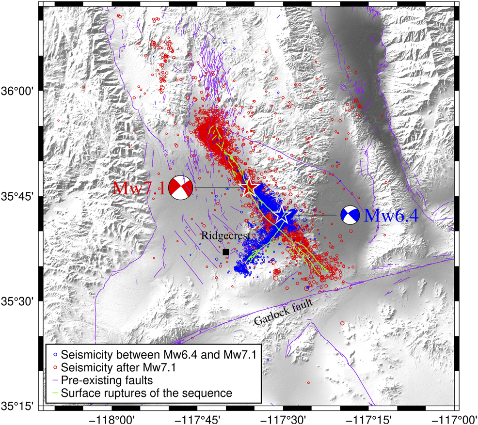 Shelly, D. R. (2020). A High-Resolution Seismic Catalog for the Initial 2019 Ridgecrest Earthquake Sequence: Foreshocks, Aftershocks, and Faulting Complexity. Seismol Res. Lett. 91, 1971–1978. doi:10.1785/0220190309