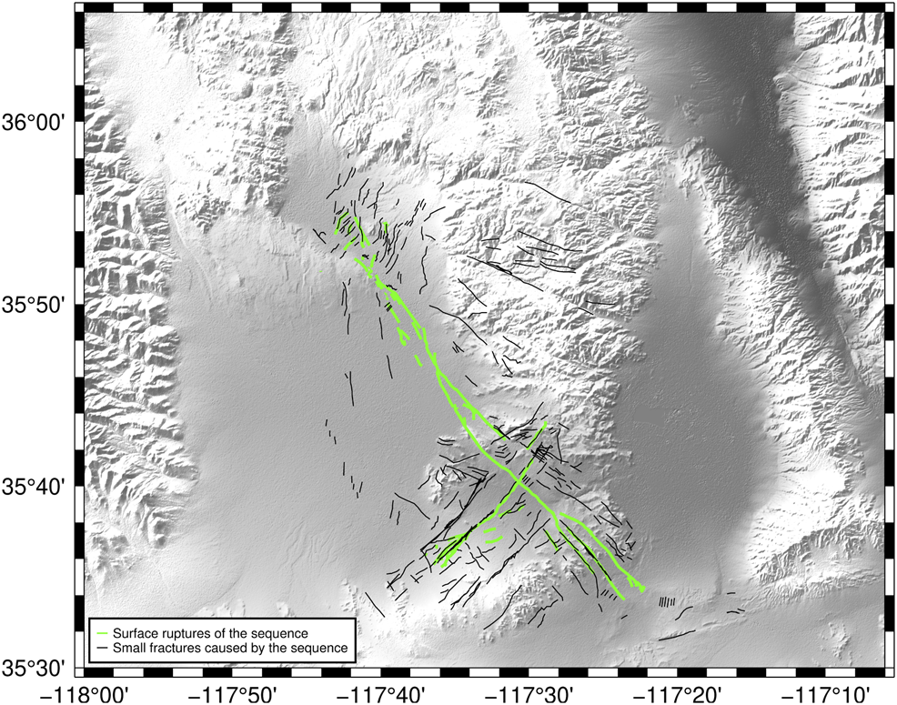 Corresponding to surface ruptures, the coseismic displacement of the Ridgecrest sequence has been well illuminated by both ascending and descending Synthetic Aperture Radar (SAR) images of the Sentinel-1, ALOS-2, and COSMO-SkyMed satellites (e.g., Xu et al., 2020a; Feng et al., 2020; Wang et al., 2020). High-resolution optical remote-sensing images are also used to study the coseismic displacement and strain along the surface ruptures, showing detailed strain tensors along ruptures of the foreshock and mainshock (e.g., Barnhart et al., 2020; Milliner and Donnellan, 2020). In addition to the right-lateral slip along the NW–SE Mw 7.1 rupture and the left-lateral slip along the NE–SW Mw 6.4 rupture, the sequence activated a series of structures with lengths ranging from 1 to 10 km, which are well revealed by phase gradient maps of SAR interferograms (Xu et al., 2020a; Xu et al., 2020b). Small fractures were also identified in the 1992 Landers and 1999 Hector Mine earthquakes (Sandwell et al., 2000; Fialko et al., 2002; Fialko et al., 2004), both occurred in the ECSZ.