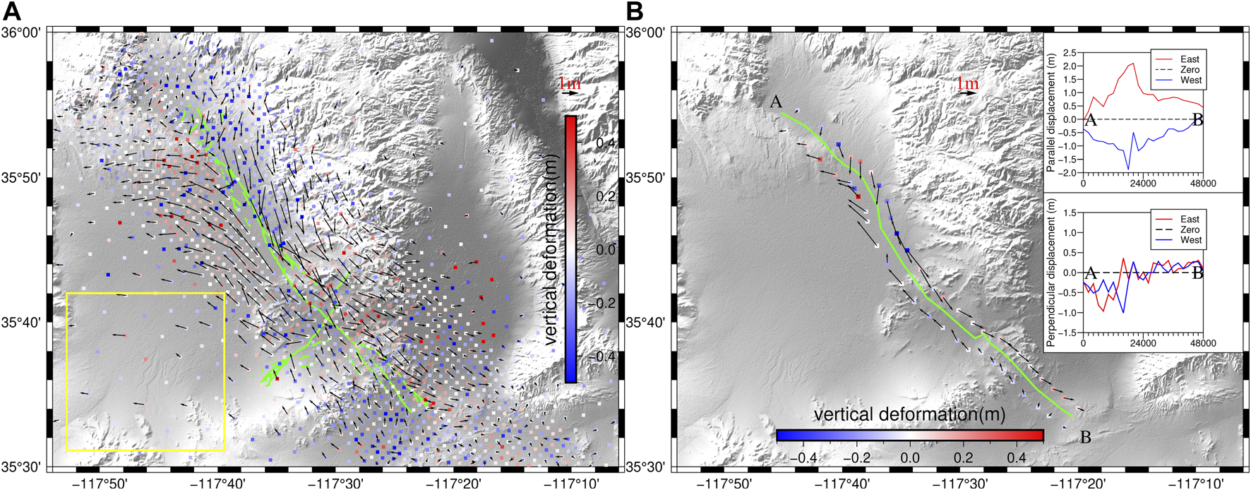 FIGURE 3. Three-dimensional (3D) coseismic displacements in the Ridgecrest region. Colored squares indicate the vertical displacements, and black arrows represent the direction and magnitude of the horizontal displacements. The area enclosed by a yellow rectangle is chosen for accuracy evaluation assuming very smooth coseismic deformation. The standard deviation of measurement points within the yellow rectangle is 0.11, 0.13, and 0.12 m along the east–west, north–south, and up–down directions, respectively. (A) Green lines show the surface ruptures of the 2019 Ridgecrest sequence (Brandenberg et al., 2019). (B) The green line shows the simplified NW–SE main rupture that we mapped according to the coseismic interferogram, phase gradient map, and pixel offsets (Supplementary Figures S1–S3). The inset shows the decomposed displacements parallel and normal to the main rupture.