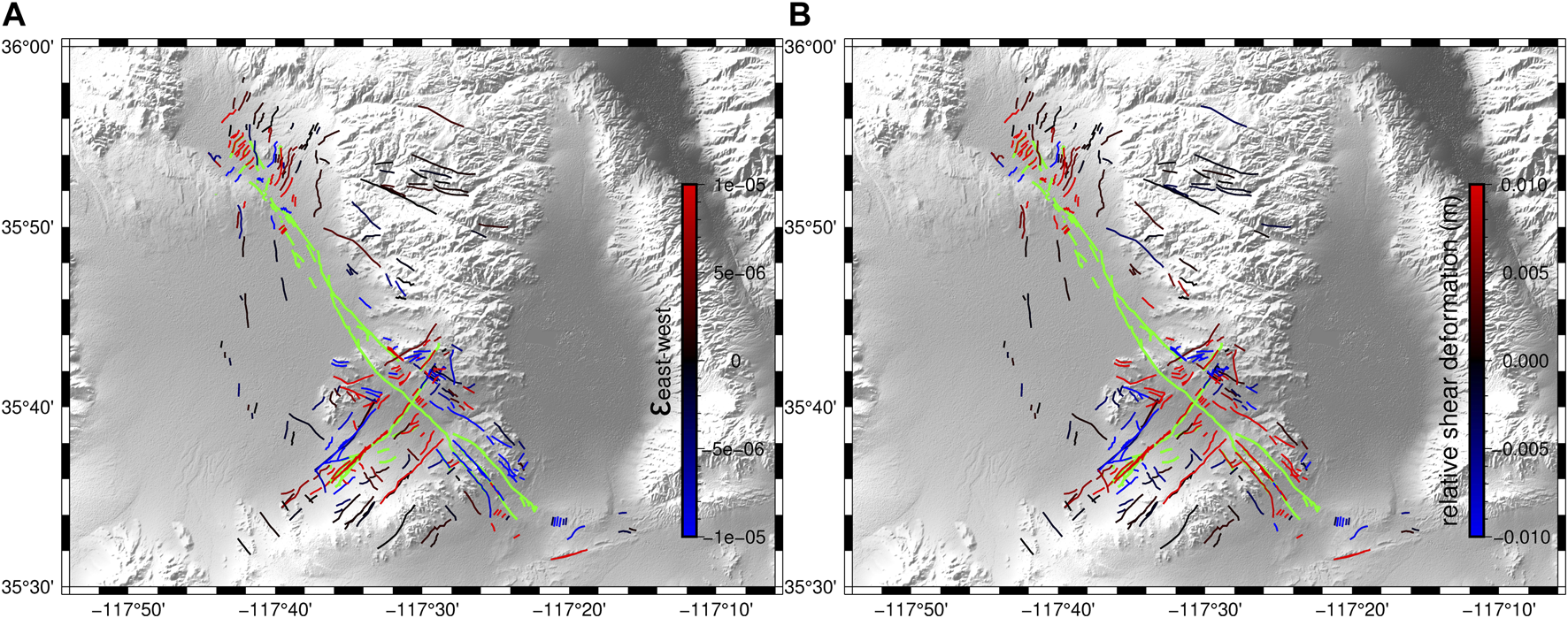 FIGURE 5. Surface deformation patterns across small fractures. (A) Colors denote the east–west strain across fractures. Blue lines indicate fractures located in the compressional strain regime, and red lines indicate fractures located in the tensional strain regime along the east–west direction. Black lines represent fractures with small east–west strain. (B) Colors represent the shear deformation across fractures. Red lines indicate the left-lateral motion, and blue lines represent the right-lateral motion. Black lines show fractures with little shear motion, i.e., the shear motion difference across the fracture is close to zero.