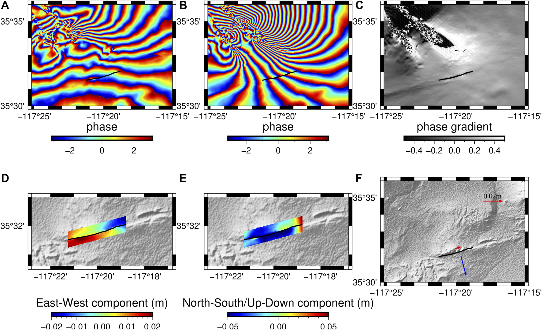 FIGURE 6. Coseismic deformation across the Garlock Fault. The thick black line indicates the segment of the Garlock Fault that slipped during the 2019 Ridgecrest sequence. Sentinel-1A interferograms of the (A) ascending track (AT64) and (B) descending track (DT71) near the Garlock Fault. The phase gradient map from the descending track (DT71) is shown in (C). (D) East–west component of displacement near the slipped segment of Garlock Fault, in which red represents slipping toward east, while blue indicates slipping toward west. (E) North–south component of displacement near the slipped segment of Garlock Fault assuming small vertical deformation, in which red represents slipping toward north, while blue indicates slipping toward south. (F) Left-lateral and tensional deformation of the slipped segment. The red arrow represents the relative slip parallel to the Garlock Fault, and the blue arrow represents the relative motion normal to the Garlock Fault.