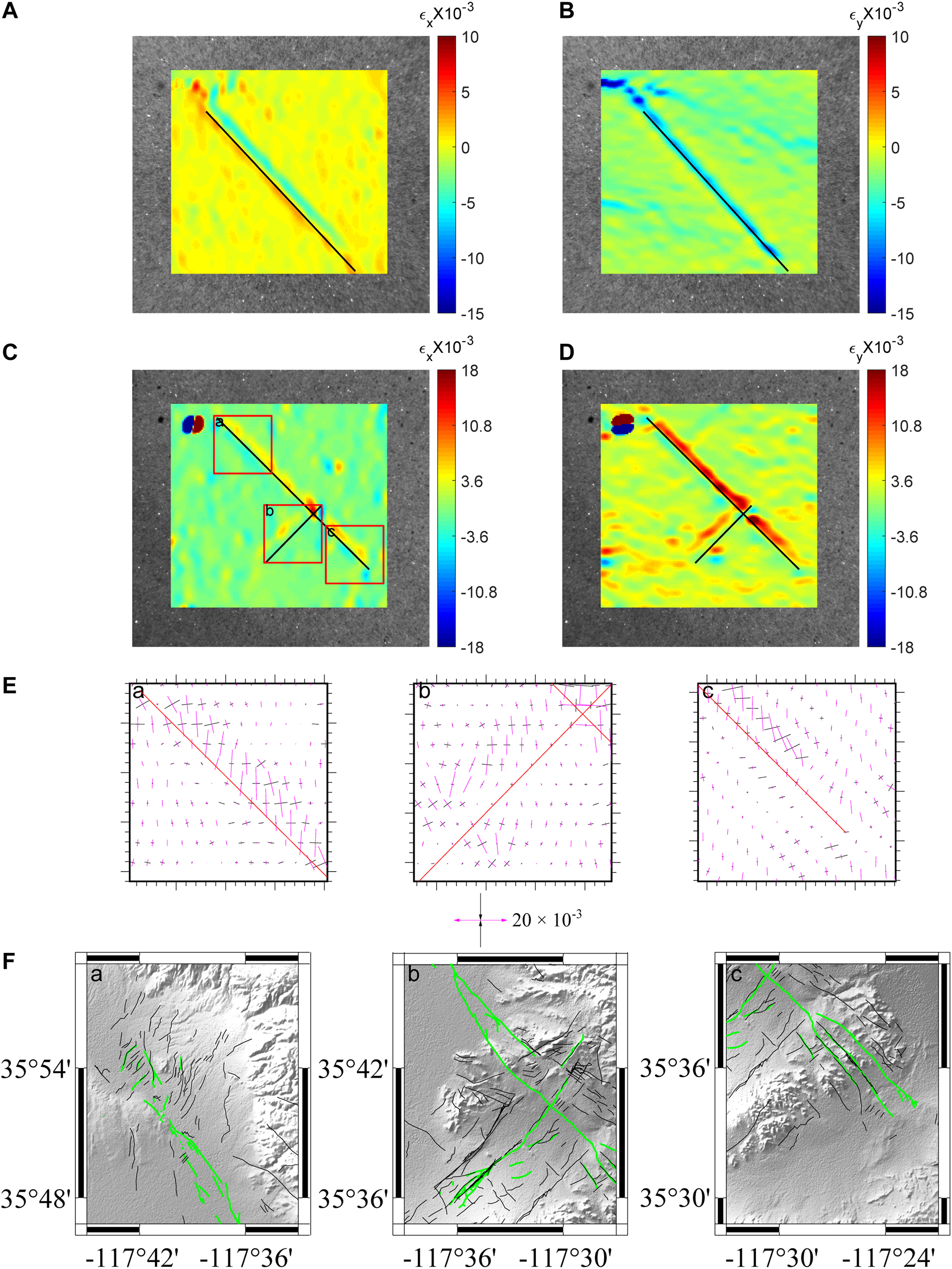 FIGURE 7. Strain fields observed before the marble samples were broken. Colors represent the strain in the direction of X-axis (A) and Y-axis (B) of the marble sample with only one prefabricated fault and of the marble sample with two orthogonal prefabricated faults (C) and (D), respectively. Positive values indicate tensional strain along the corresponding axis, while negative values indicate compressional strain along the axis. The black line indicates the prefabricated fault, and the loading direction is along the negative direction of Y-axis. The principal strain axes within the red rectangles in (C) are shown in (E). The red lines indicate the prefabricated faults, and the black lines represent compression, while the magenta lines represent extension. Surface fractures produced by the earthquake sequence in the corresponding areas are shown in (F) for comparison.