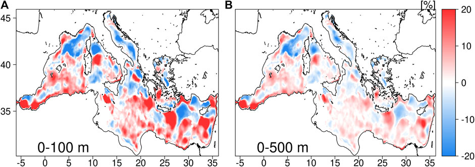 Mesoscale eddies can act as gateways for heat absorption and loss in the ocean. It is then interesting to quantify how eddy-driven anomalies affect the ocean heat content (OHC). At a depth range between 0 and 700 m, the OHC in the Mediterranean Sea was in the order of 109 J m−2 (basin integral over the period 1993–2016; not shown), in agreement with the already existing estimates for the Mediterranean basin (von Schuckmann et al., 2016; Iona et al., 2018). Considering those initial estimates as a reference, Figure 9 shows the OHC anomalies obtained considering long-lived eddies (≥ 4 weeks). In particular, the values are expressed as a percentage (%) of total ocean heat content monthly standard deviation, obtained integrating MED-REA ocean temperature fields over different depth ranges. Considering a depth range between 0 and 100 m, the mesoscale contributions to the OHC in the Mediterranean Sea were in the order of 20%. Positive (negative) contributions reflected the characteristics of ACE (CE) eddies, acting as warm (cold) cores and thus underlying their role in modulating the magnitude OHC in the upper ocean. As already discussed in Section 3.3, a maximum depth of 500 m was selected to look at 3D eddy-driven anomalies. At this depth range, contributions up to 15% were observed in the occurrence of the most prominent mesoscale features.