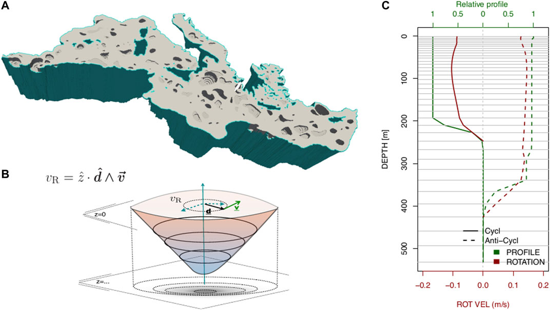 FIGURE 10. (A) Example of one-week-long eddy population detected in 1 day. (B) Schematic illustration of vertical change in orbital velocity. (C) Examples of relative vertical profile (green) generated by the rotational velocity vR (red color) for cyclonic (solid line) and anti-cyclonic (dashed) eddy at each vertical level. The relative vertical profile shows the vertical inner shape of the eddy defined by its area at each vertical level, normalized by the area at the surface. It is therefore always 1 at the surface and 0 at the bottom; the vertical line going from 1 to 0 corresponds to the eddy shape segmented by the detection system.
