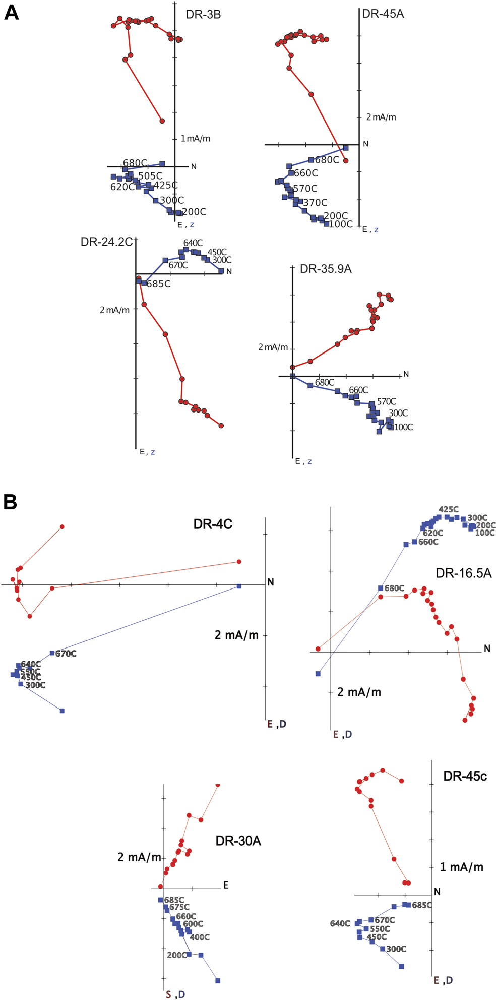 (A) Vector endpoint diagrams for the stepwise thermal demagnetization of the Rainstorm Member samples. Red circles are horizontal component, blue squares are vertical component. Stratigraphic coordinates. Samples DR-3B, DR-45A, and DR-35.9A show the westerly ChRM, Sample DR-24.2C shows the more easterly ChRM. (B) Vector endpoint diagrams for the stepwise thermal demagnetization of Rainstorm Member samples with intermediate directions and VGPs. Same symbols as in (A). Note the clear separation of low temperature and high temperature components except for sample 30A.