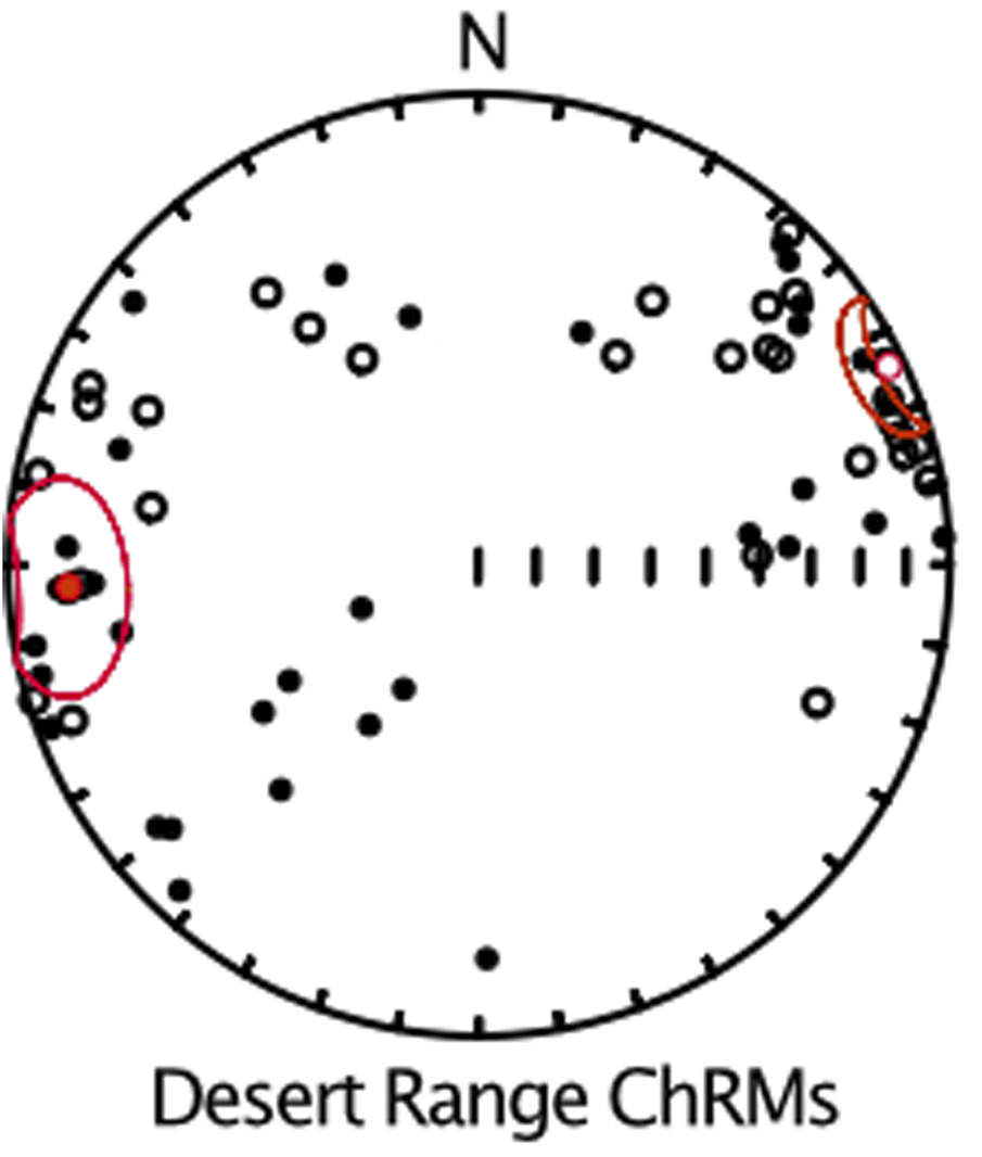 Characteristic remanence directions for the thermal demagnetization data of the Rainstorm Member from the Desert Range. Open circles, upper hemisphere, filled in circles, lower hemisphere. Red lines show mean directions for the western set of directions (normal polarity) and eastern set of directions (reversed polarity) along with their α95 circles of 95% confidence. Intermediate directions cluster in the southwest and toward the north.