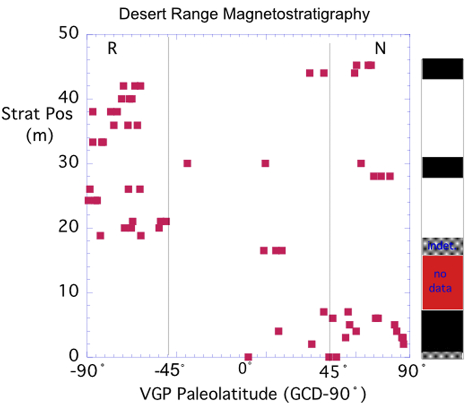 Magnetostratigraphy for the Rainstorm Member samples from the Desert Range. The VGP paleolatitude (great circle distance of each sample’s VGP from the mean paleomagnetic pole −90°) for the Rainstorm Member is plotted as a function of stratigraphic position. Note the 9.5 m gap in data between 7 m and 16.5 m which will be filled in the combined magnetostratigraphy developed using the Nopah Range and Winters Pass Hills data.