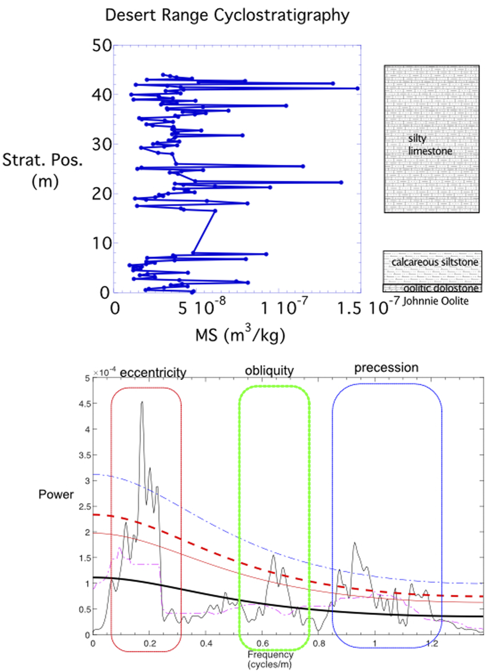 Desert Range Cyclostratigraphy. (top) Mass normalized magnetic susceptibility (χ) data series for the Desert Range. Samples taken at 25 cm stratigraphic spacing. Note the higher and lower frequency cycles in the data series. Lithostratigraphic column is based on field observations and Stewart and Barnes (1966). (bottom) MTM spectrum of the magnetic susceptibility data series calculated by Acycle (Li et al., 2019). Black line is robust red noise model (Mann and Lees, 1996) with 90% (thin red line), 95% (dashed red line), and 99% (dashed blue line) confidence intervals. Significant spectral peaks are outlined in boxes consistent with (Berger et al., 1992) theoretical peaks for short eccentricity (125/95 ka), obliquity (29 ka) and precession (18.7/16 ka) at 500 Ma.