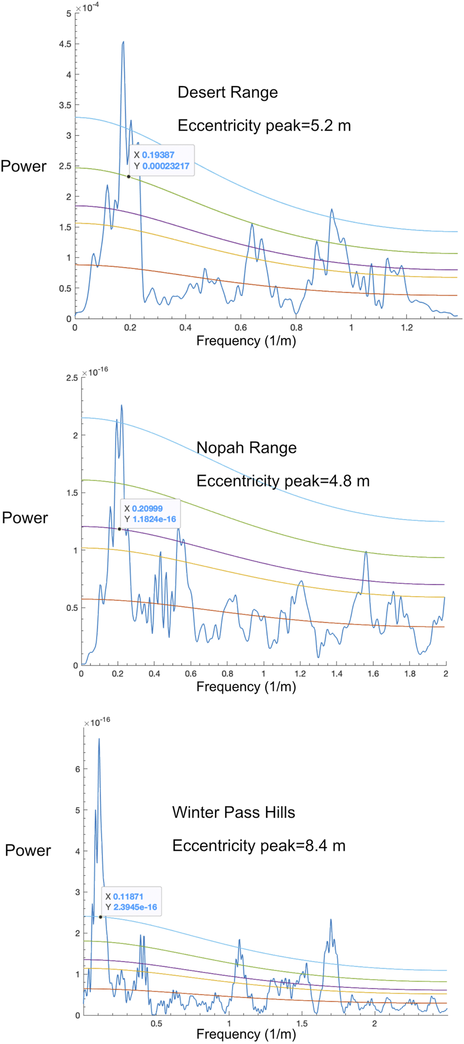 MTM power spectra calculated by Acycle from the Desert Range, the Nopah Range, and Winters Pass Hills. The Nopah Range and Winters Pass Hills data are from Minguez et al. (2015). The stratigraphic periods of the highly significant spectral peak assigned to short eccentricity are labeled for each plot. The Desert Range and the Nopah Range both have short eccentricity peaks close to a 5 m period, while the Winters Pass Hills has a short eccentricity peak with a longer stratigraphic period indicating a higher SAR. These relationships in SAR will be used to produce a combined stratigraphy from these three localities of the Rainstorm Member.