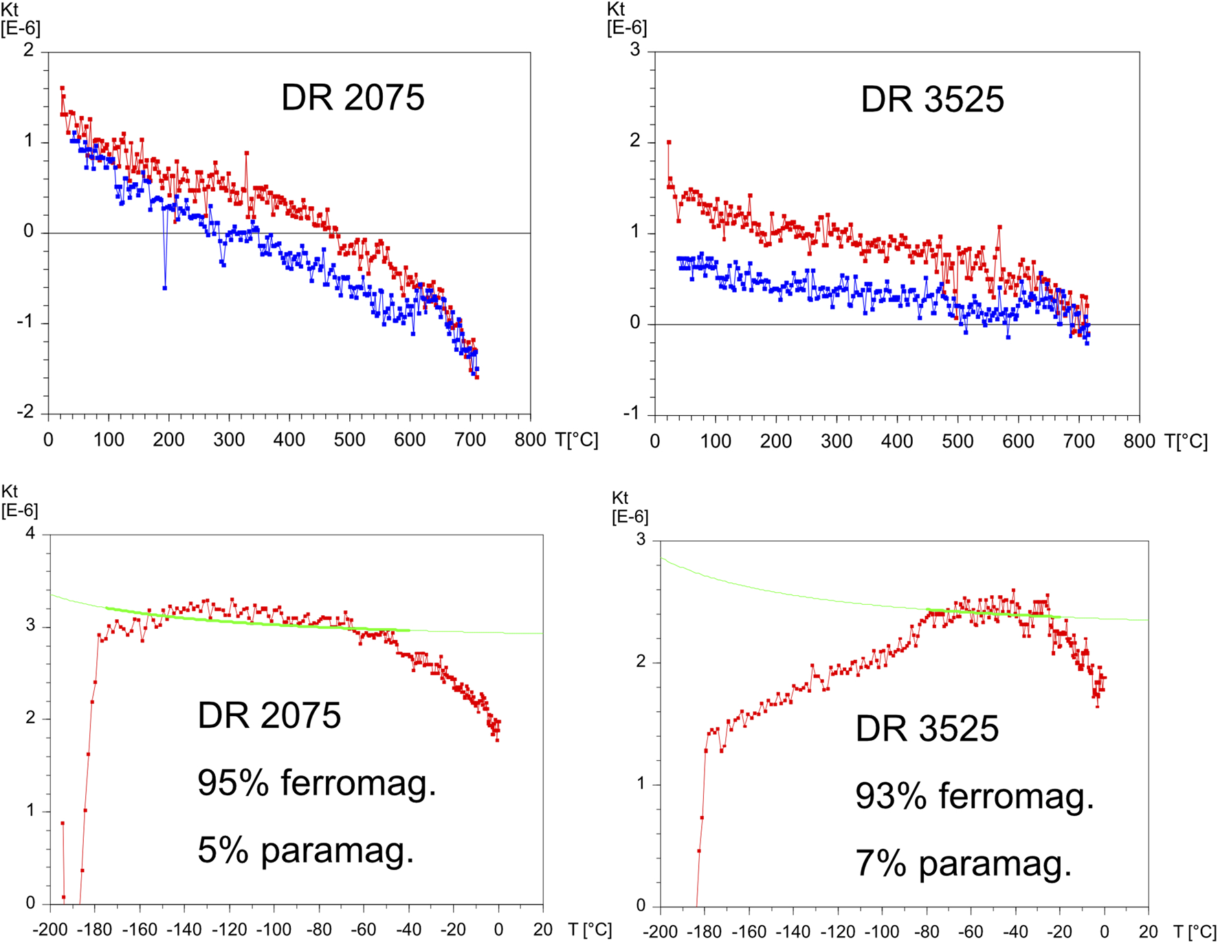 Magneti susceptibility vs temperature plots for Rainstorm Member samples. The top plots show the magnetic susceptibility behavior between room temperature (nominally 20°C) and 700°C. Red data is the heating curve, blue is the cooling curve. Note magnetic susceptibility shows evidence of a decrease during heating at about 680°C suggesting hematite as the main magnetic mineral carrying the susceptibility. The cooling curves both show a decrease at about 580°C, suggesting magnetite may have been destroyed during the heating. The bottom two plots show the magnetic susceptibility behavior between liquid nitrogen temperatures (−196°C) and 0°C. The poor fit of the 1/T paramagnetic hyperbola (green) to the data suggests that most of the susceptibility is carried by ferromagnetic, rather than paramagnetic, minerals. The data shown in the top plots would suggest that ferromagnetic mineral is hematite.