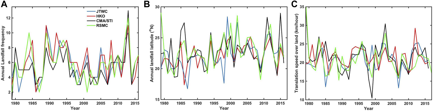 FIGURE 1. Historical TC characters of (A) TC landfall frequency, (B) latitude of typhoon landfall, and (C) TC translation speed, from the converted JTWC, HKO, CMA/STI, and RSMC best track data, respectively.