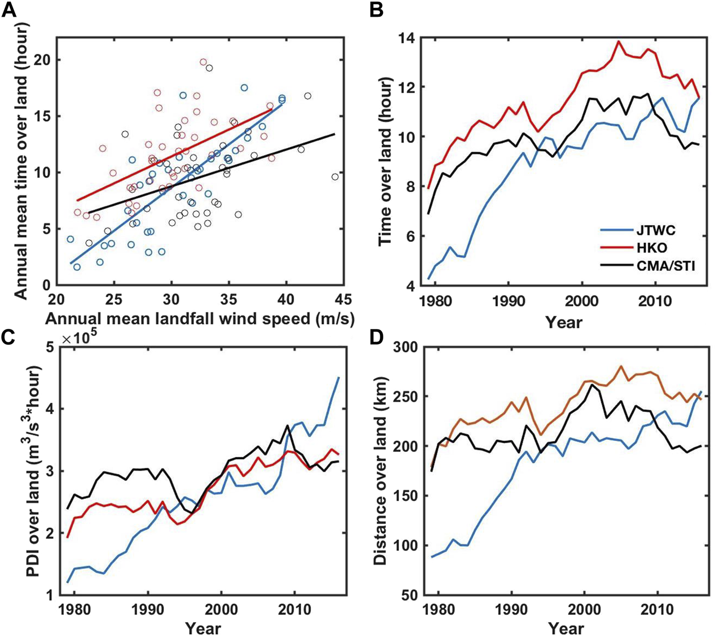 FIGURE 4. Changes of the influences of WNP TCs over land since the 1979. (A) Relationship between annual mean landfall intensity and time duration over the land; (B–D) are the 11-year moving averaged sustaining time, PDI, and travelling distance over the land from JTWC, HKO, and CMA/STI best track datasets, respectively.