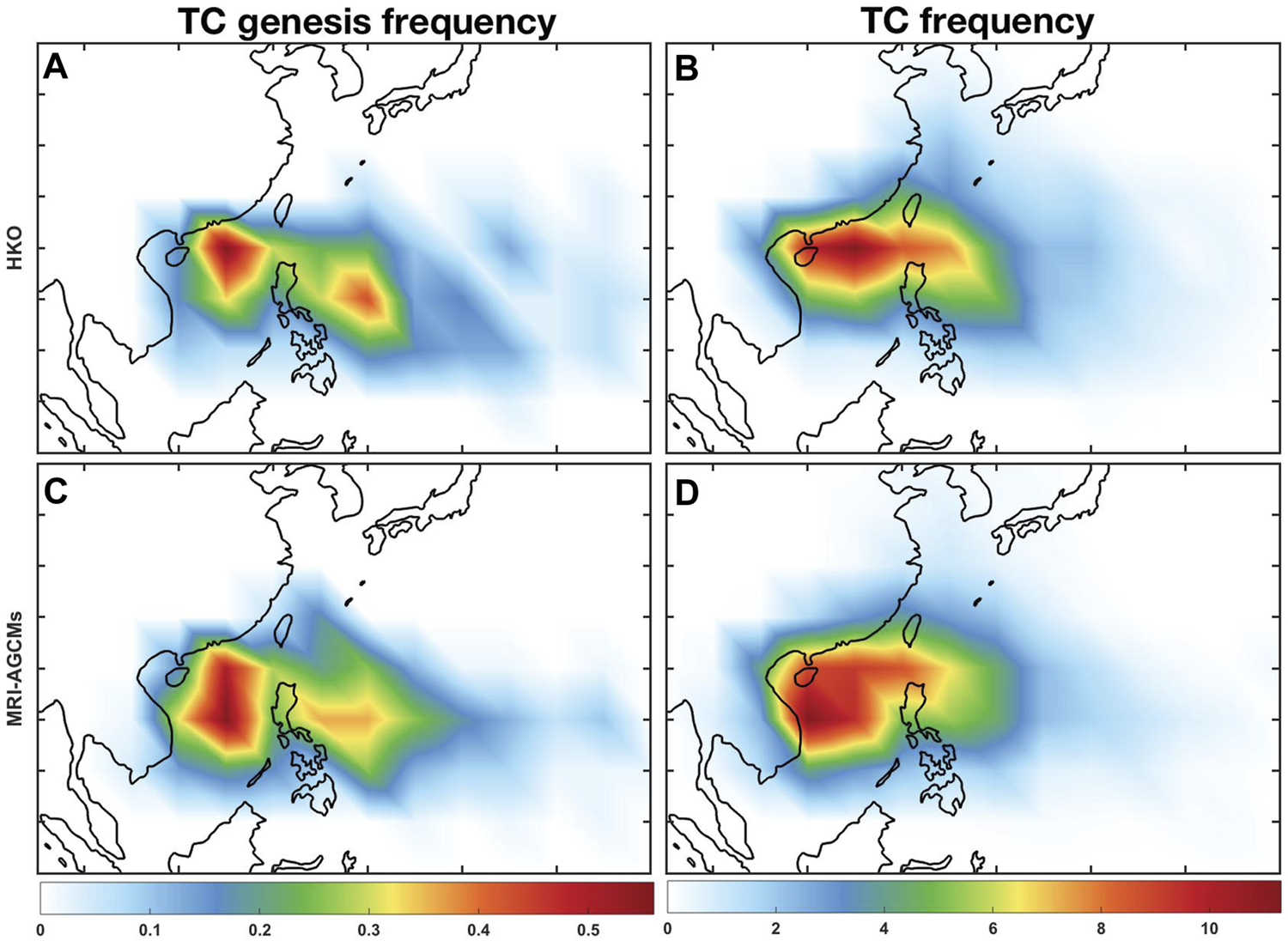 FIGURE 6. Comparisons of observed (A,B) and MRI-AGCM3.2s–simulated (C,D) WNP land-falling TCs genesis frequency (A,C), and occurrence frequency (B,D) in the period between 1979 and 2003.