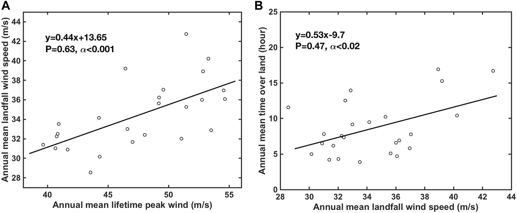 FIGURE 7. MRI-AGCM3.2s simulated relationships in (A) between TC annual lifetime peak intensity and the landfall wind speed and (B) between the TC annual landfall wind speed and time duration over the land.