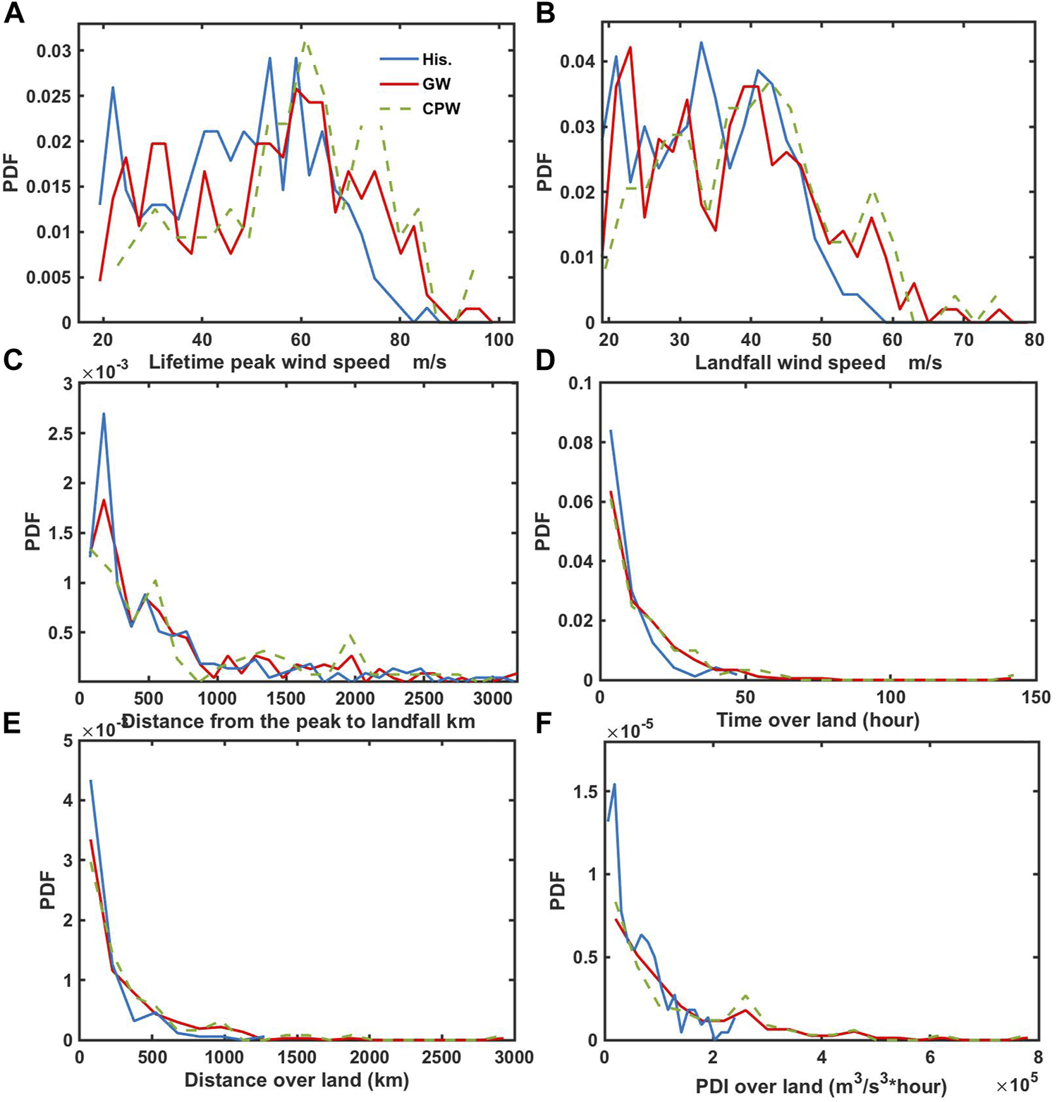 FIGURE 8. MRI-AGCMs simulated and projected PDFs changes of WNP TC and TC inland impacts. (A–C) are the PDFs changes of TC lifetime peak intensity, landfall intensity, and Dpl, respectively. (D–F) are the changes of PDFs of sustaining time, distance travelled, and PDI over land, respectively. Blue lines and red lines represent data in the present-day (1979–2003) and global warming condition ensemble mean (2075–2099) according to RCP8.5 scenario, respectively, while dashed green lines represent data in the CP warming cluster.