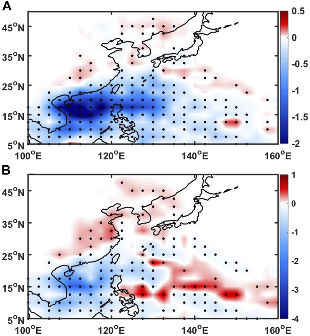 FIGURE 9. MRI-AGCM3.2s projected WNP TC frequency change between the present-day (1979–2003) and global warming condition (2075–2099) according to RCP8.5 scenario. (A) TC frequency change in the global warming ensemble mean, computed for 2.5° × 2.5° grid boxes. (B) same as (A) but the 2075–2099 period is based on the CP warming cluster. Black dots represent values passing the 0.05 significance level based on Monte Carlo tests.