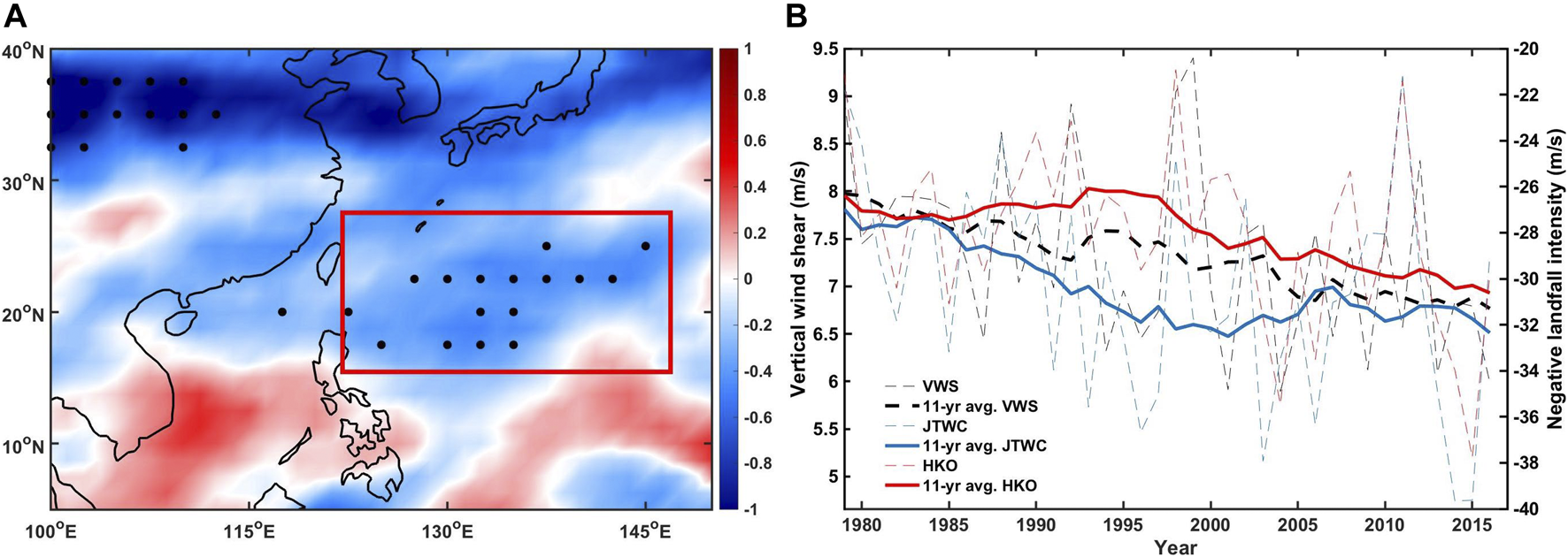 FIGURE 11. (A) Linear trend of vertical wind shear (m/s per decade) in JJASO over WNP and the Asian region, 1979–2016. The area in the red box is where strongest vertical wind shear change occurs. Black dots denote trend signals passing the 0.05 significance level according to the Mark–Kendall test. Data are from JRA-55. (B) Comparison of the annual mean vertical wind shear change within the red box in (A) and the annual mean landfall intensity change. TC landfall intensities are calculated from JTWC and HKO best track datasets.