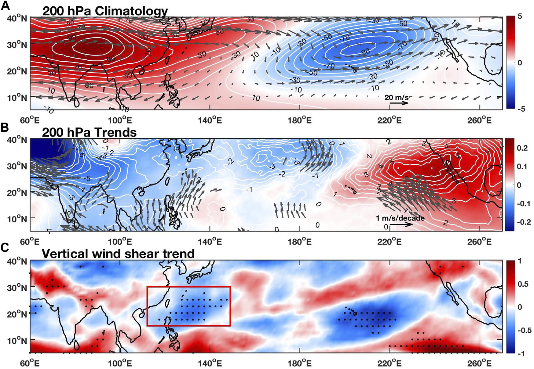 FIGURE 12. General circulation change and weakened vertical wind shear over far western WNP. (A) 1970–2016 summer season (JJASO) climatological values of the 500–200 hPa layer mean eddy temperature (i.e. with zonal average removed; shading, Units: K), 200 hPa eddy geopotential height (contours, Units: m), and 200 hPa wind (vectors Units: m/s). (B) Same as (A) but for linear trends (in per decade) of the same variables. (C) Linear trend of vertical wind shear (m/s per decade) in JJASO, 1970–2016. The region in the red box is where most of WNP landfalling typhoons pass by. Vectors in (B) and black dots in (C) denote trend signals passing the 0.05 significance level according to the Mark–Kendall test.