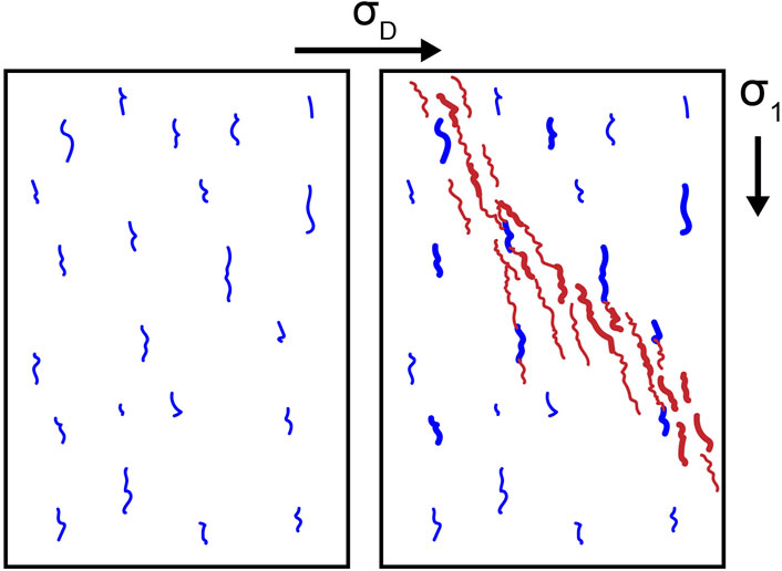 Preexisting weaknesses control how and when rocks fail because they concentrate shear and tensile stresses that promote fracture propagation under relatively low differential stress (e.g., Griffith, 1921). These early fractures tend to propagate parallel to the maximum compression direction,