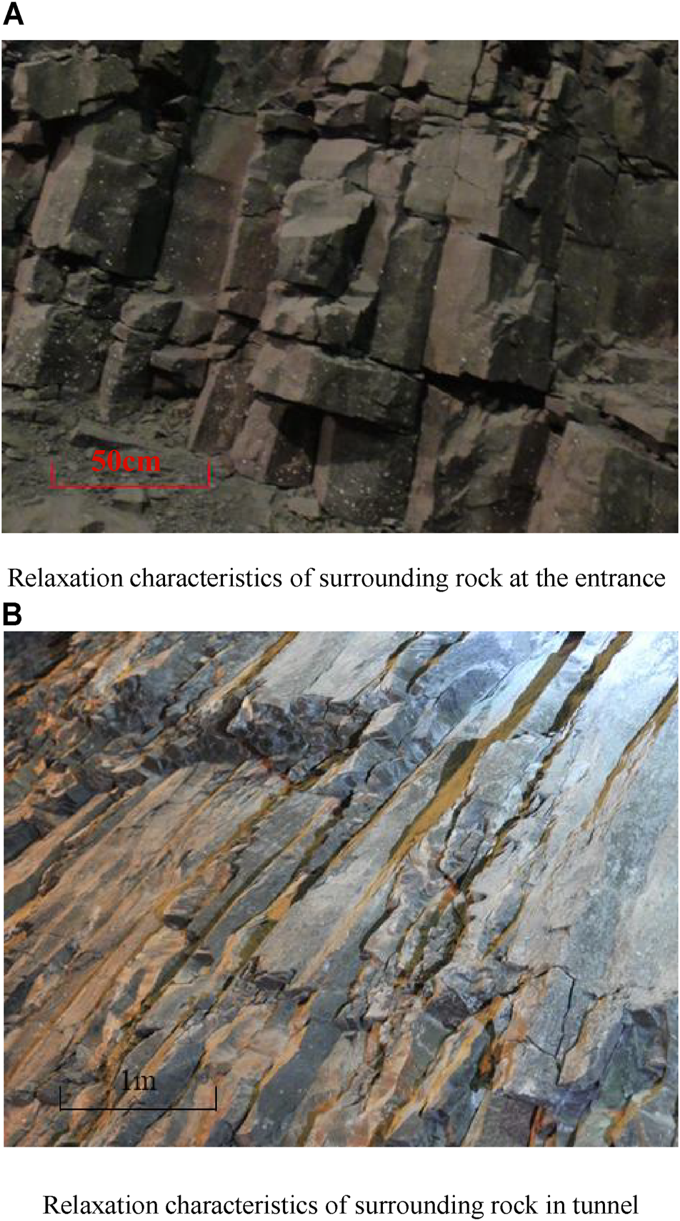 In the excavation process of the diversion tunnels, unloading phenomena such as structural plane opening, tensile fracture, and rock mass relaxation appear in the surrounding rock near the excavation face. After the adjustment of the stress field near the surrounding rock, the original structural planes open and new fractures form. The widths of unloading fractures gradually decrease from the entrance to the end of the tunnel. Figure 4 shows the comparison of relaxation characteristics of the columnar jointed basalt in different sections of the diversion tunnel. The unloading fractures in the entrance section are generally developed, and are filled with gravel, rock debris, and secondary mud (Figure 4A). The relaxed columnar jointed basalt shown in Figure 4B maintains a certain integrity. Although most of the original columnar joints are open and the columns are relaxed, the rock blocks are still interlocking.