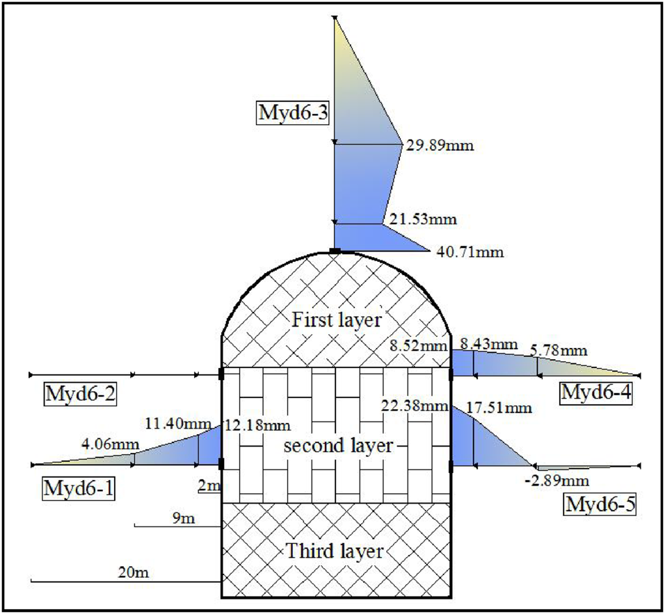 Taking the No.4 diversion tunnel as an example, this paper studies the unloading relaxation of columnar jointed basalt. The diversion tunnel is excavated in three steps from top to bottom. The upper layer is 9 m high, the middle layer is 9 m high, and the lower layer is 6.2 m high. After excavation, the three-point displacement gauges are used to monitor the deformation of multiple sections of the tunnel. The deformation displacement was recorded at the depth of the hole at 0, 2, and 9 m to obtain excavation response characteristics of the columnar jointed rock mass. The layout and deformation of the multi-point displacement gauges of the 1 + 075 section are shown in Figure 5. After excavation, the top arch has the largest deformation, the shallow deformation reaches 40.71 mm, and the deep deformation also reaches 29.89 mm, which is due to the stress concentration at the arch top. The deformations of the side walls are smaller than that of the arch top. The displacement gauge in Myd6-2 measuring hole is damaged and has no recording. The displacements recorded by gauges in the remaining three monitoring holes show that the deformations of the side walls gradually decrease from shallow to deep. And the deformation of the lower part of the side wall is slightly higher than that of the upper part of the side wall, and the maximum deformation appears in the lower part of the left side wall, which is 22.38 mm.