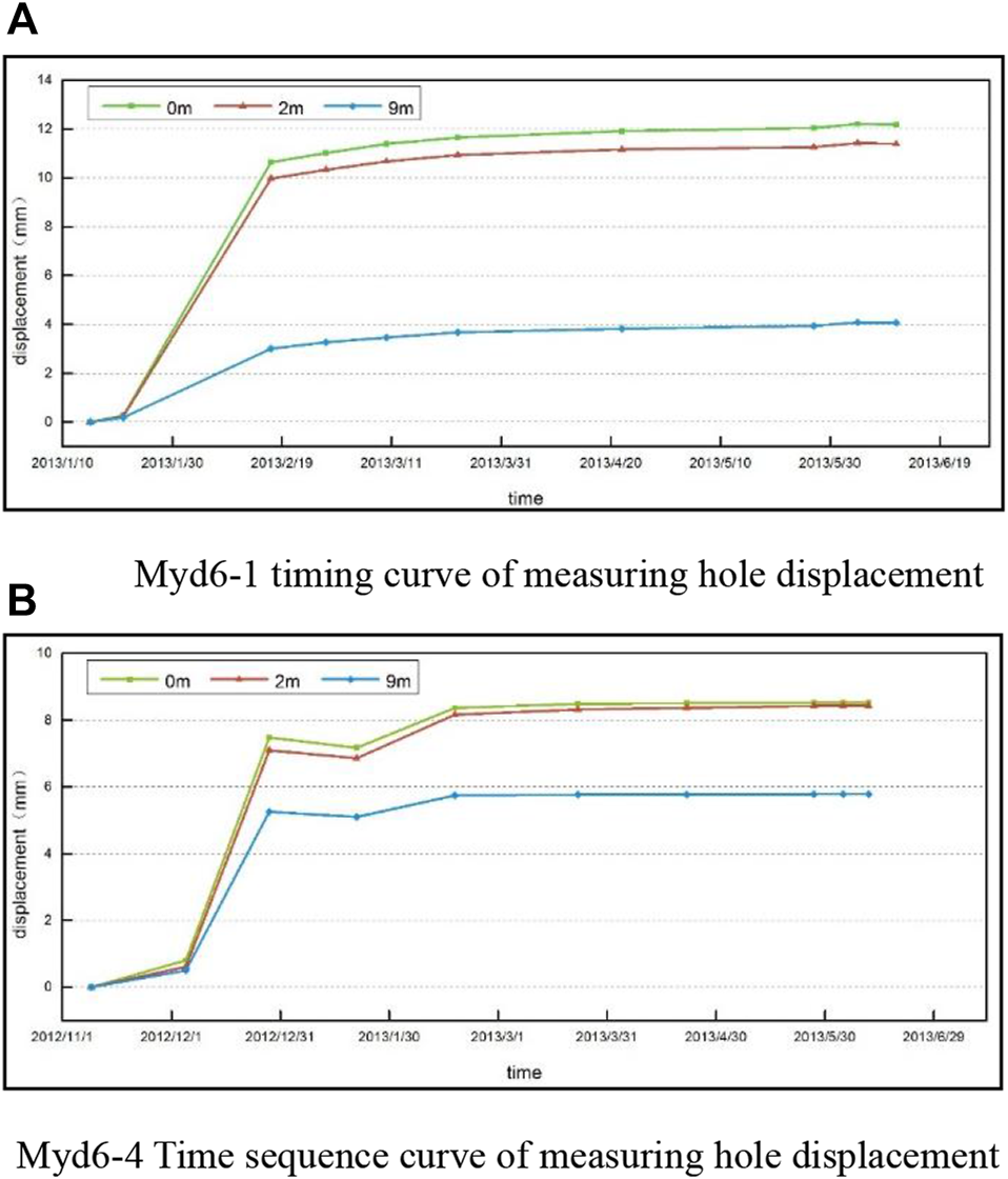 Displacement sequence curve. (A) Myd6-1 timing curve of measuring hole displacement. (B) Myd6-4 Time sequence curve of measuring hole displacement.