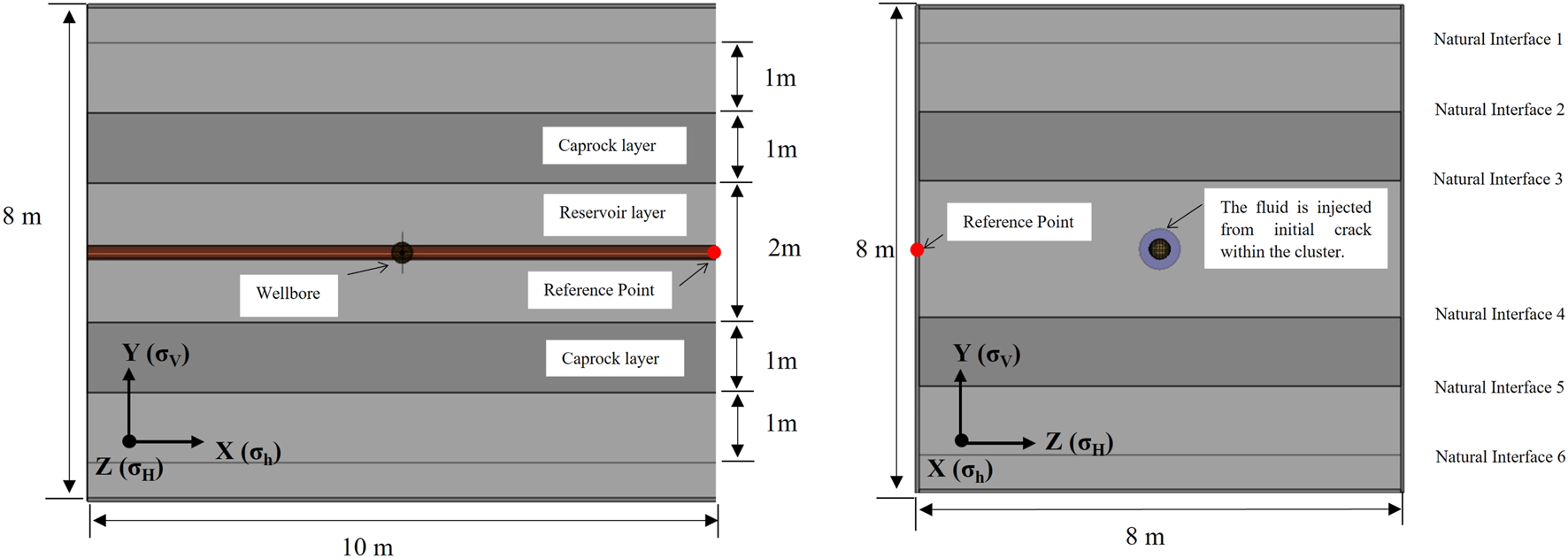 In this study, a two-caprock layer model with laminations in a horizontal direction was established for simulation purposes. The model, as shown in Figure 2A, has a length (along the X-axis), width (along the Z-axis), and height (along the Y-axis) of 10, 8, and 8 m, respectively. The reservoir layer of 2 m height is located in the middle of the model. The caprocks are homogenous materials with 1 m thickness placed above and below the reservoir formation. The six zero-thickness interfaces 1 m apart from each other, as labeled from 1 to 6 in Figure 2B, were used to characterize the cemented natural interface between layers. The principal stresses were considered as σh = 5 MPa, σv = 10 MPa, and σH = 8 MPa in X, Y, and Z directions, respectively. It is important to note that in order to speed up the simulations, the stress differences were applied to the model, rather than the total stresses. This will have no impact on the fracture geometry but only fracture pressures. The fracture is initiated from a cluster in the middle of a horizontal wellbore, which is placed along the X-axis (or σh) direction. The spherical cluster is the point of fracturing fluid injection, and a small starter crack (notch) is placed perpendicular to σh in order to facilitate fracture initiation.