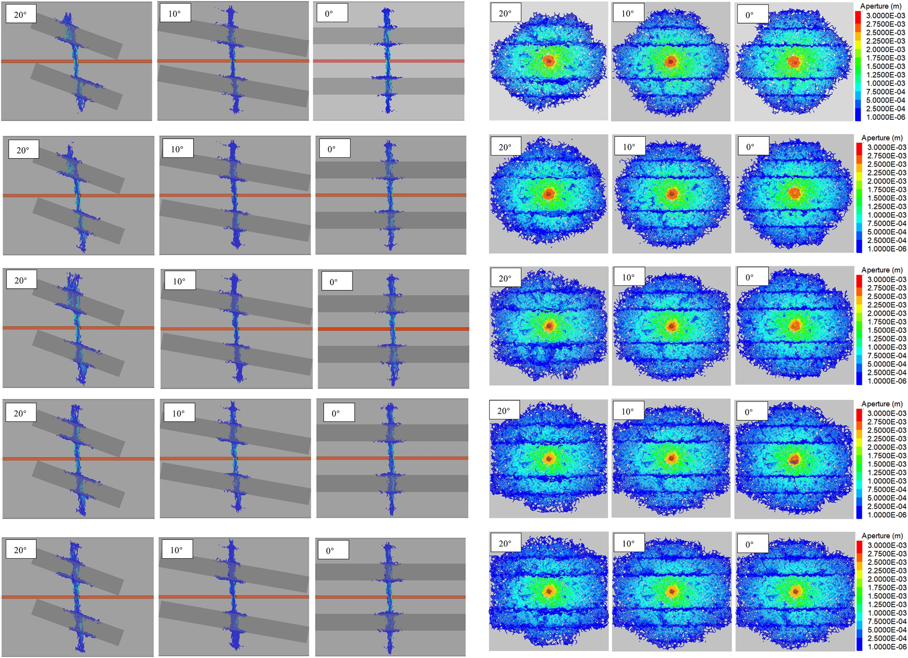 Figure 7 presents the TSA and SSA corresponding to Figure 6. From these figures, it is seen that as σv increases, the total-SA decreases. Specifically, the SSA has the largest proportion of the contribution to the total SA decline compared to the TSA, implying that high-stress anisotropy results in less stimulation of the interface during HF operation. This finding is also reported by previous research, which claimed a higher differential stress causing a shorter offset in the interfaces (Chuprakov et al., 2010).