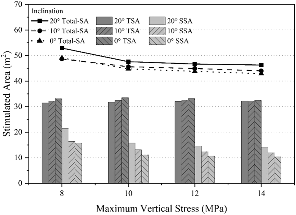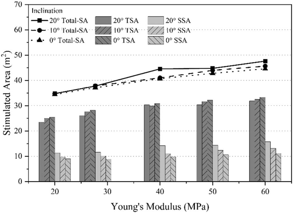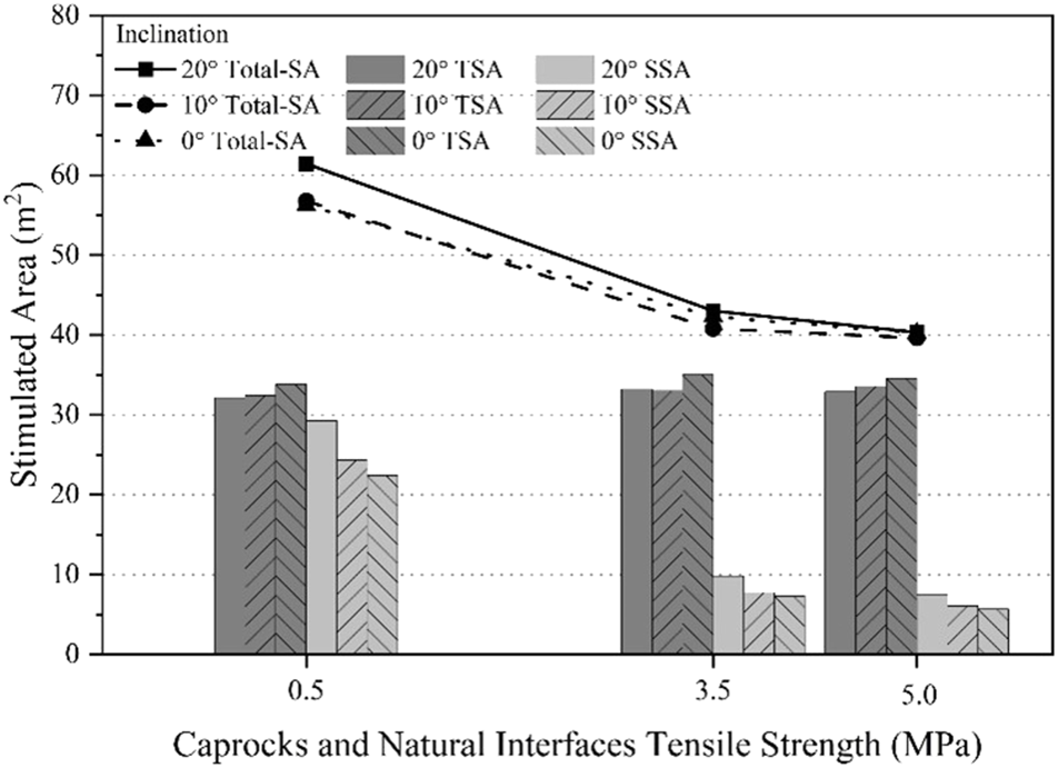 Figure 4 presents the TSA and SSA corresponding to the results of Figure 3. The total SA is the sum of the TSA and SSA. The results of this figure show that TSA and SSA values are increasing in lockstep as the caprock Young’s modulus increases. However, the change in inclination for TSA and SSA shows the opposite trend. Larger inclinations correspond to higher SSAs but lower TSAs. This is due to the fact that when the HF intersects the natural interface orthogonally (i.e., the layers’ inclination is 0°), as opposed to the lower angle of approaches, the crossing interaction mode is more favorable to occur. This finding agrees with previous research works (Gu and Weng, 2010).