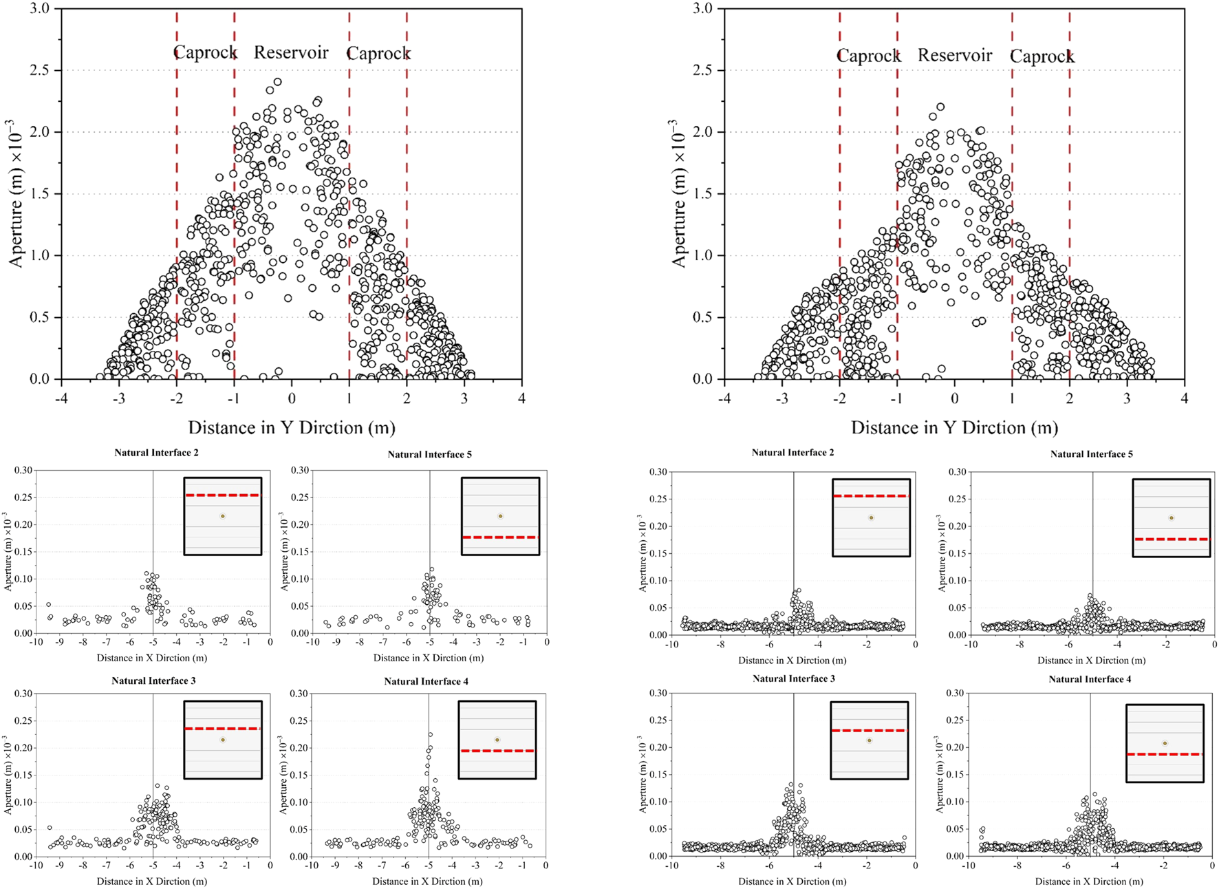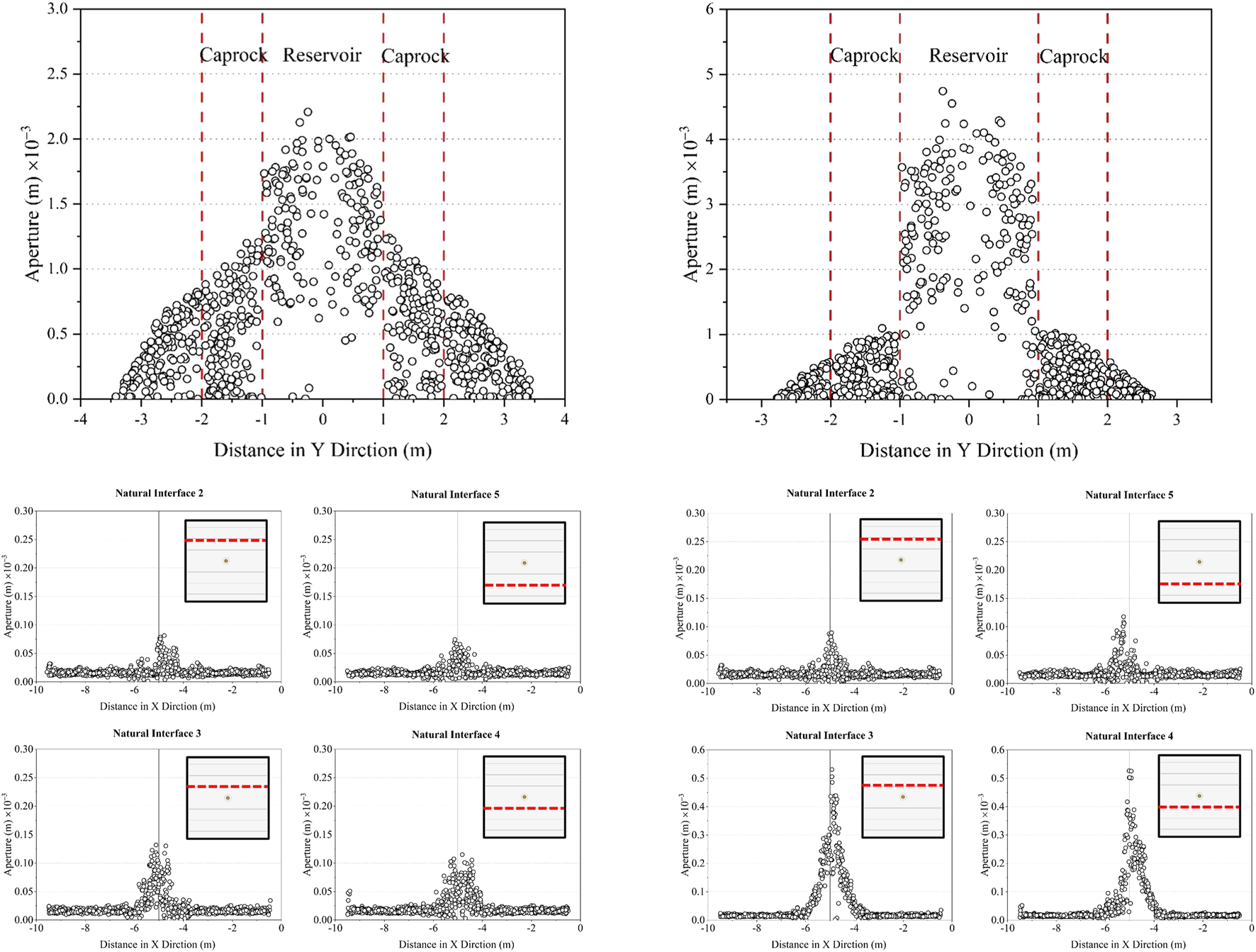 Profiles of the HF aperture in the YZ plane at X = −5 m for injection rates of (A) 0.02 m3/s and (B) 0.1 m3/s. The wellbore injection point is at Y = 0 m. And profiles of the natural interface aperture in the XZ plane at Z = 4 m for injection rates of (C) 0.02 m3/s and (D) 0.1 m3/s. HF in this plane is at X = −5 m. The diagram in the upper right shows the position of the corresponding natural fracture in the model.