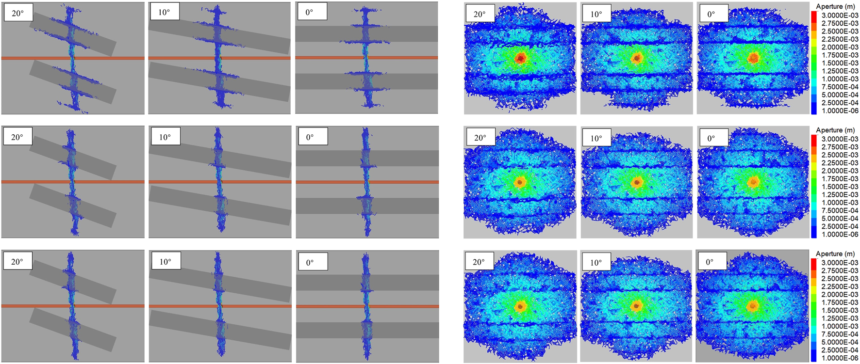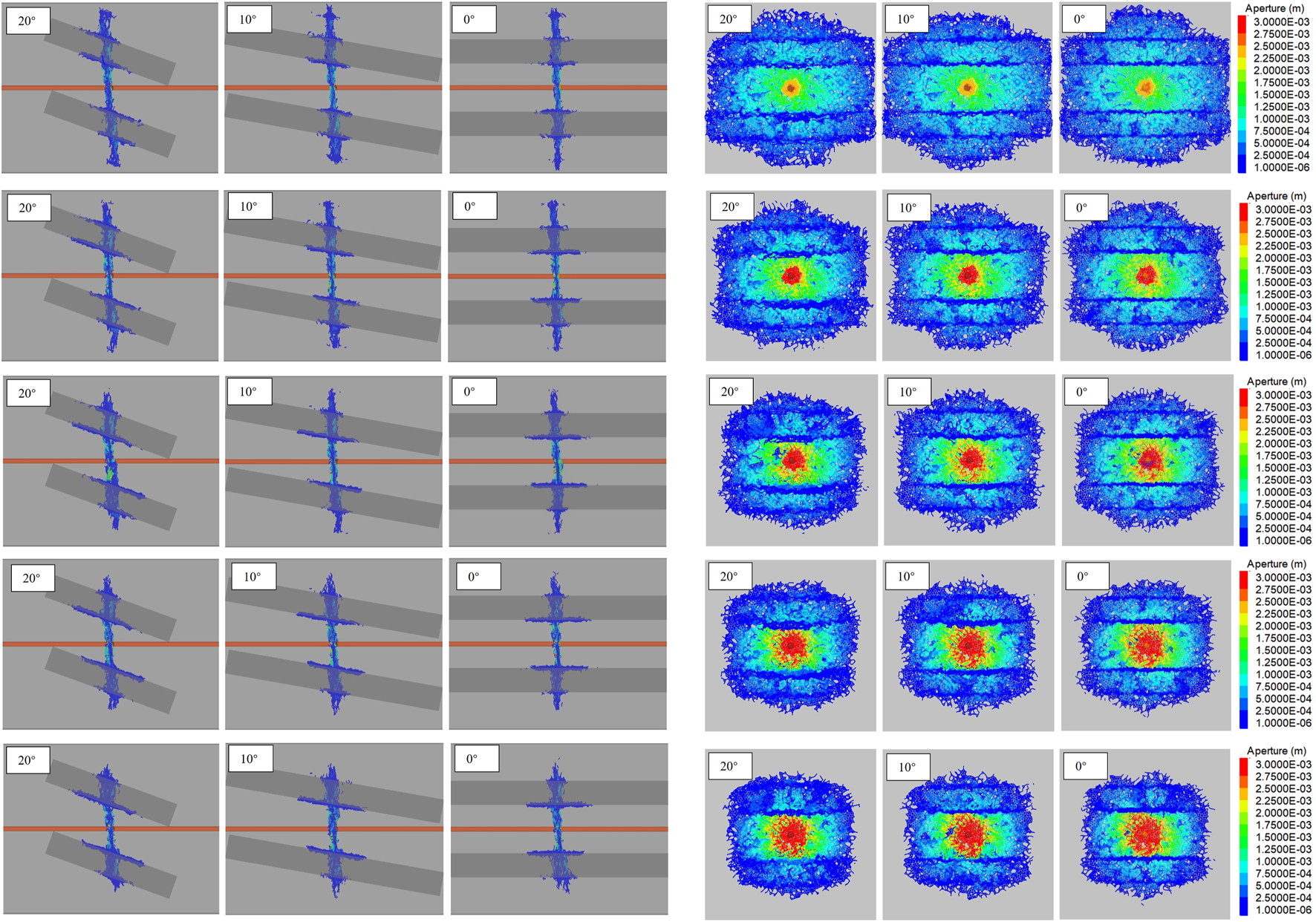 The lattice simulation used in this study consists of a series of quasi-randomly distributed, non-linear spring-connected nodes as a representation of the nodal and rock matrices. Fluid flow throughout the node network, including pre-existing joints and newly developed fractures as well as the rock matrix, and the resulting pressures are used to calculate the effective stresses (i.e., conditions that cause deformation and affect damage). To better simulate non-linear behaviors, such as fracture, sliding, and fracture opening/closing, all codes use display solutions. The discrete fracture network (DFN) is overlaid on a lattice spring network, assigning elasticity and strength parameters of the crack to the spring. If two nodes of a spring are placed on opposite sides of a joint plane, the spring will obey the smooth joint model (SJM) approach. During the analysis, only the direction of the discontinuity plane is considered, rather than the direction of the individual springs along the joint plane. The angle of the plane becomes the dominant direction when the joint plane cuts the spring (instead of the direction of the spring) (Damjanac and Cundall, 2016).