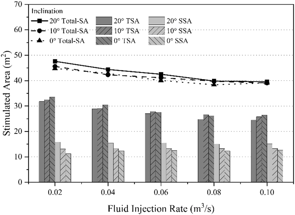 Effect of the fluid injection rate and inclination on tension and shear stimulated areas (TSA and SSA).
