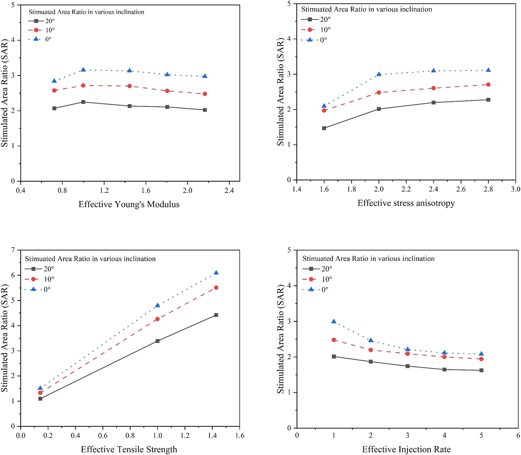 Effect of (A) Young’s modulus, (B) stress anisotropy, (C) tensile strength, and (D) injection rate on stimulated area ratio (SAR).