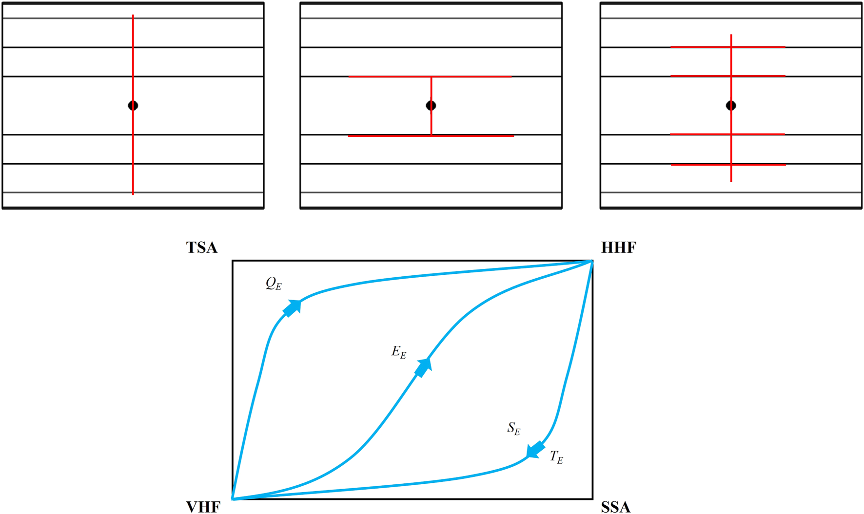 The evolution of HF from vertical to horizontal propagation modes can be visualized schematically in Figure 14D, where the bottom left and top right vertexes represent the vertical hydraulic fracture (VHF) and horizontal hydraulic fracture (HHF) propagation, respectively. In this figure, the bottom right and top left vertices represent the tension and shear stimulated areas, respectively. The transition between VHF and HHF propagation regimes is determined by the SAR. This means that the tensile strength and stress anisotropy enable HF to evolve from HHF to VHF via the path close to the SSA, whereas the injection rate evolves from the VHF to HHF via the path along the TSA. Furthermore, Young’s modulus has an effect on the propagation mode through the TSA and SSA, causing it to follow a nearly diagonal path along the rectangle. Further investigation is needed to better understand the relationships between the SAR, the total stimulated area, and the HF network (HFN).