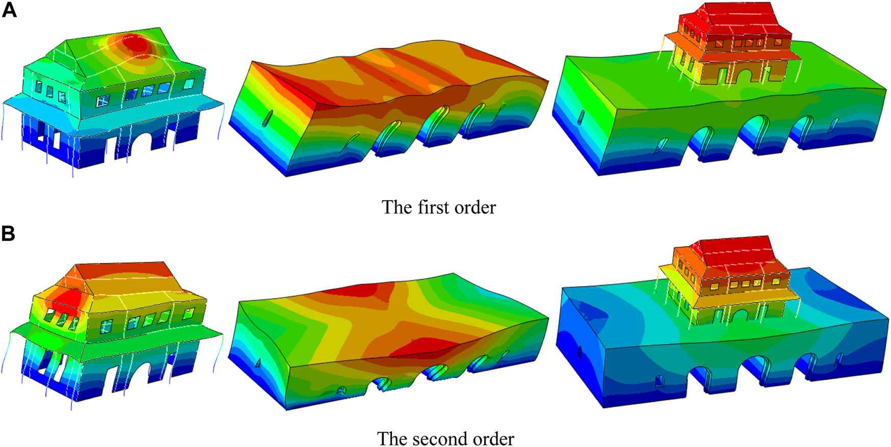 Vibration modes of the Drum Tower model. (A) The first order. (B) The second order.