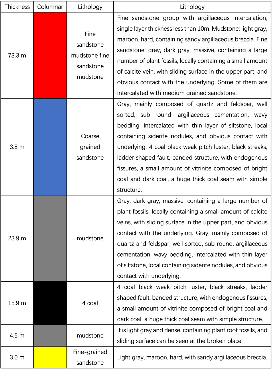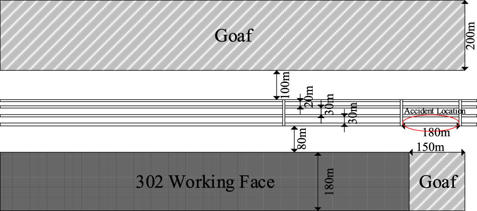 There are four tunnels 100 m south of goafs 204, 205, and 206, including the west-wing haulage roadway, the second section of the air-inlet roadway, the belt roadway, and the air-return roadway with gaps of 20, 30, and 30 m between each roadway, respectively. The working face of mine 302, which is 180 m wide, is located 80 m south of the air-return roadway (Figure 1). The coal seam is 590.5 m deep and the overlying layers within 100 m are less than 10 m thick, with a uniaxial compressive strength of <60 MPa. The overlying strata consist of sandstone and mudstone (Figure 2). The coal seam has a dip angle of 4 and a uniaxial compressive strength of 15 MPa. The floor of the coal seam consists of coarse-grain sandstone, mudstone, and fine-grain sandstone. The test results show that the coal seam and roof strata are prone to failure because of rockburst, whereas the reverse is true for floor strata.