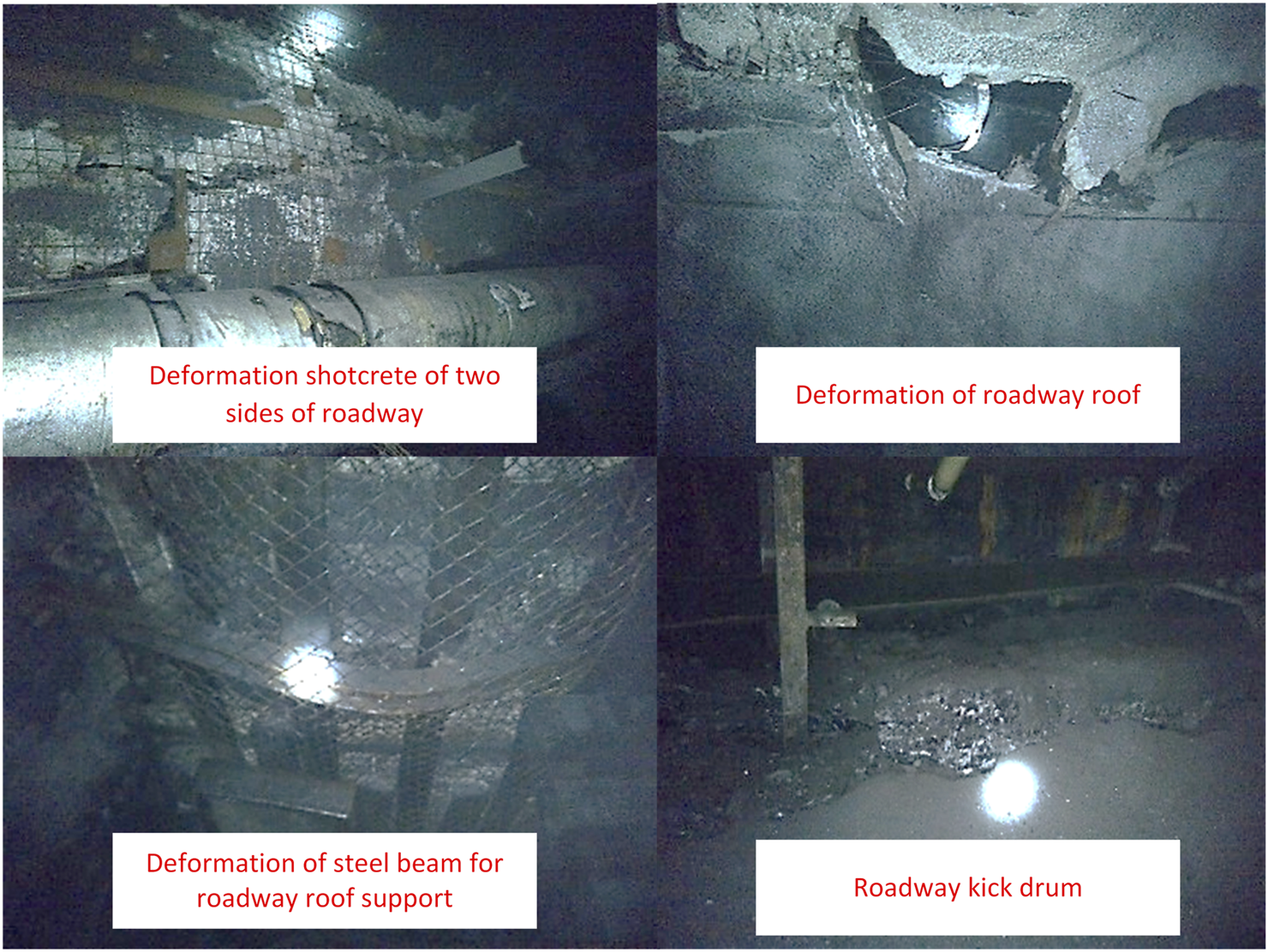 On February 25, 2017, the belt roadway, the air-return roadway, and the connecting roadways experienced gunite-layer cracking, cracking of the walls and roof, the heaving of the floor and walls, and deformation because of the combined effects of the lateral abutment pressure from three consecutive goafs (204, 205, and 206), as well as the lateral abutment pressure from the working face 302 and the mining stress; this resulted in significant damage to the tunnel support systems, with roof protrusion of up to 1 m at a maximum. All the roadways were set inside the coal seam. Photographs of the damage caused by the rockburst are shown in Figure 3 and the exact locations are shown in Figure 4.
