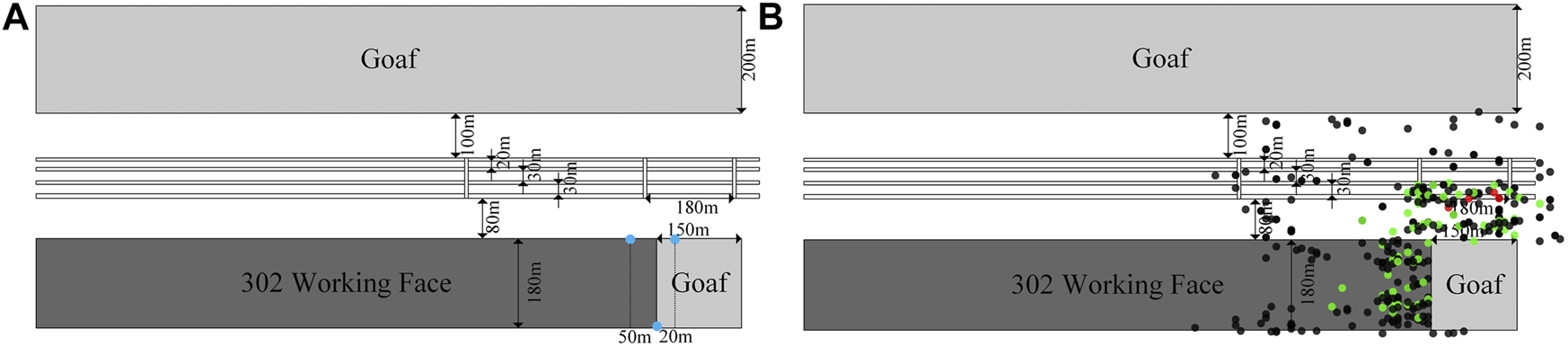The tunnel-cut coal pillar has experienced a dense distribution of microseismic events over time because it has been subjected to stress from the lateral goaf, the cutting tunnel, and the working face of the mine. Figure 5 is a schematic of microseismic monitoring points and the locations of the events. Three mobile sites for microseismic monitoring were located in the working face 302 (Figure 5A), one in the air-return roadway and one in the air-inlet roadway, each with a horizontal separation distance of 20 m; another was located in the air-inlet roadway, which was situated 50 m ahead of the working face. The black circles in Figure 5A represent microseismic events with an order of magnitude of 102 or less, whereas the green circles represent events of magnitude 103, and the red circles represent events of magnitude 104. Figure 5B shows that numerous microseismic events occurred in the roadways and in the front of the working face, especially at the side close to the working face 302. The tunnel-cut isolated area featured a dense distribution of microseismic events of a large order of magnitude, indicating that the rock system retained a massive amount of elastic energy, with the tunnels cutting through the isolated area. The lateral abutment pressure and tunnel-cutting behavior resulted in energy accumulation and a concentration of stress in the isolated area in the mining of the working face. When the abutment pressure reached a critical level, the coal-rock mass fails, releasing a significant amount of energy and causing a rockburst.