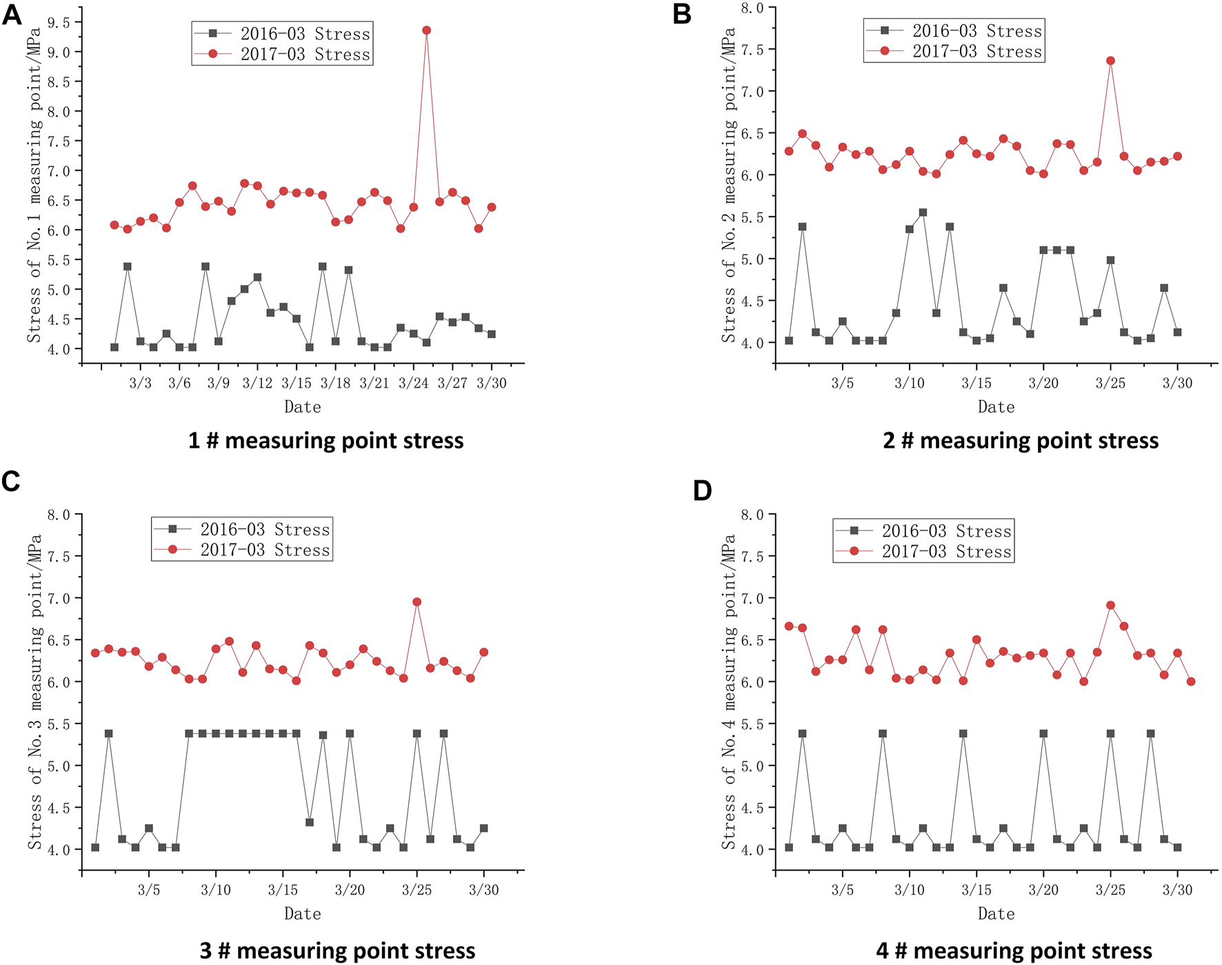 Stress gauges were installed in the air-return roadway, belt roadway, the second section of the air-inlet roadway, and the railway (for transport) in the west wing. The gauges were numbered 1#, 2#, 3#, and 4#. The stress values in March 2016 and 2017 are shown in Figure 8, indicating that the average stress values for the air-return roadway, belt roadway, the second section of the air-inlet roadway, and the railway in the west wing in March 2016 were 4.33, 4.50, 4.46, and 4.47 MPa, respectively, with all values increased significantly in March 2017 (Figure 8). For example, the stress value for gauge 1 (Figure 8A) reached 9.39 MPa, more than double of the previous year. The lateral abutment pressure from the goaf, the tunnel-cut action, the constant settlement of the overlying strata over the goaf, and the mining working face ultimately affected the roadways, resulting in deformation and failure of the roadways and support systems.